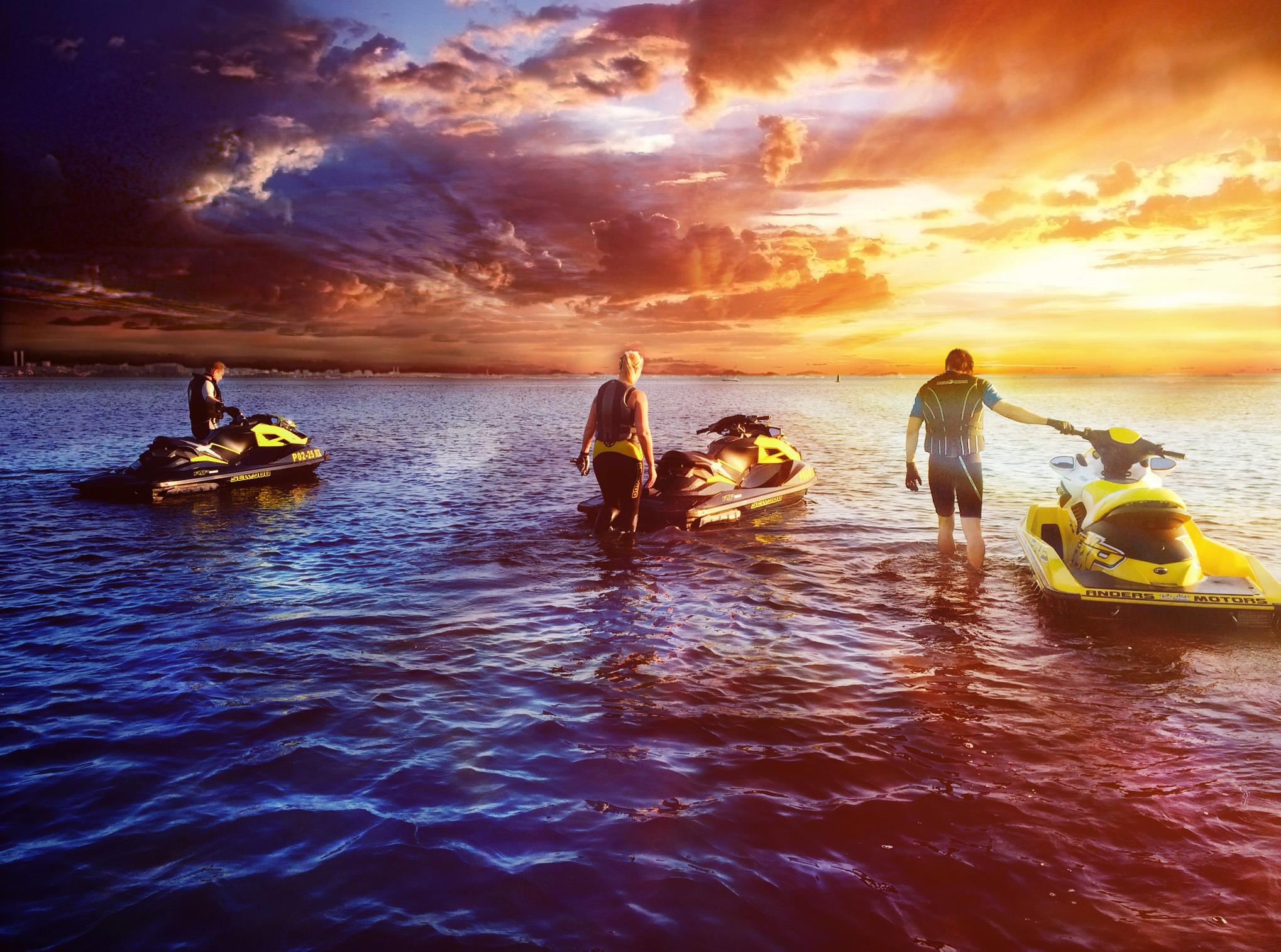 Автор: Ирин КаХрИз ступора всех вывел необычный звук. Пришедший с обратной стороны пирса, из-за самолёта, звук едва слышно работающего мотора и шелеста воды. А потом к месту, где они стояли, на скорости вылетел водный мотоцикл. От крутого виража при торможении, когда Югём успел подумать, что машина сейчас просто перевернётся, в одно мгновение поднялся огромный веер брызг, легко преодолевший расстояние до пирса и широким фронтом накрывший сидевшего на канате Дэна.