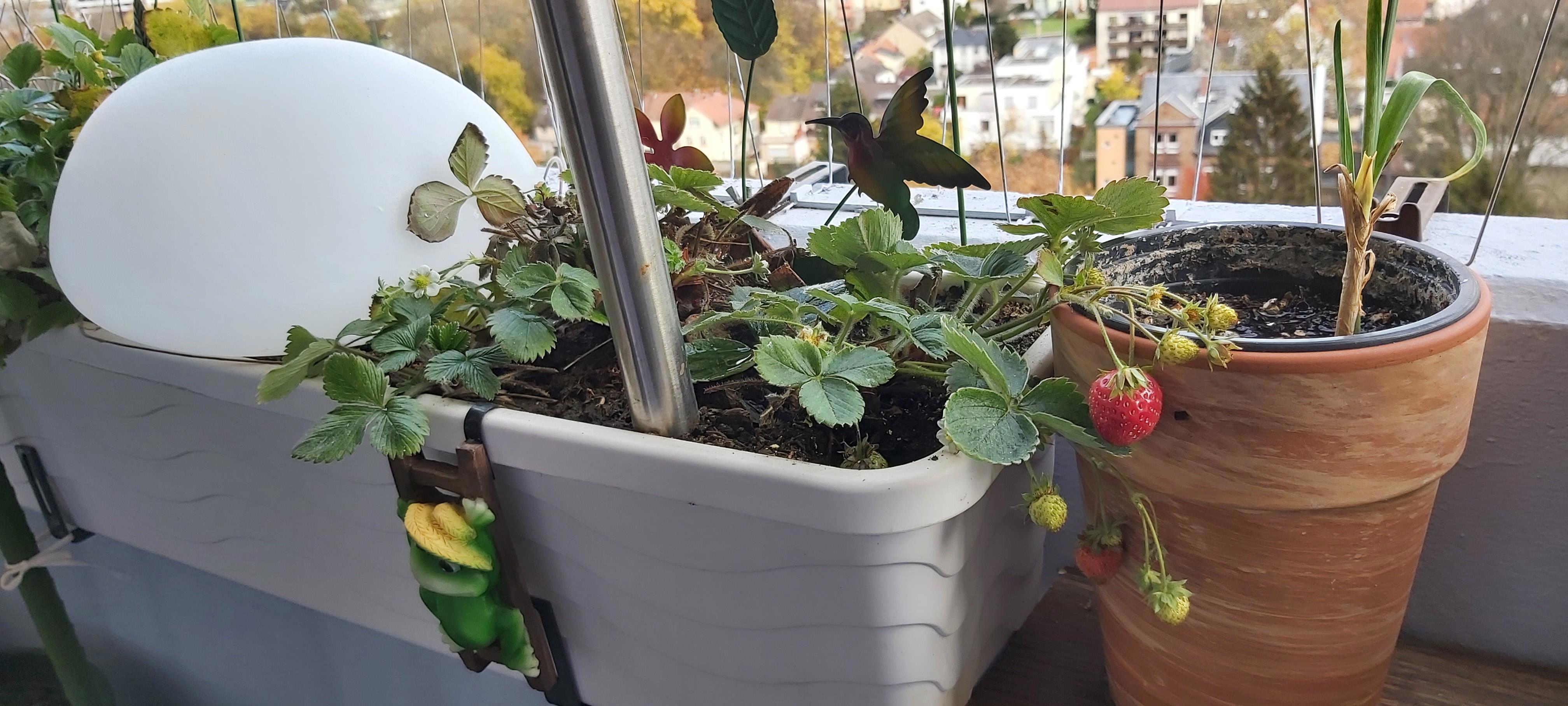 Сегодняшнее фото: клубничка созрела втихаря, так как она пряталась за горшком с чесночком, но мы её нашли и вызволили.