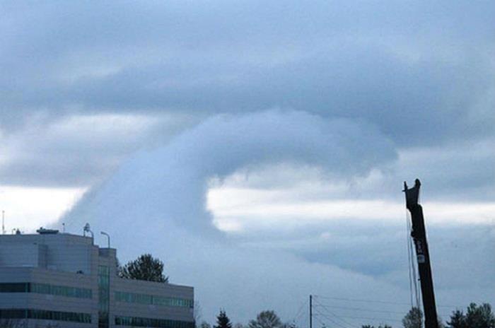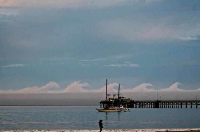Это облака Кельвина-Гельмгольца, напоминающие гигантские волны, разбивающиеся о берег.