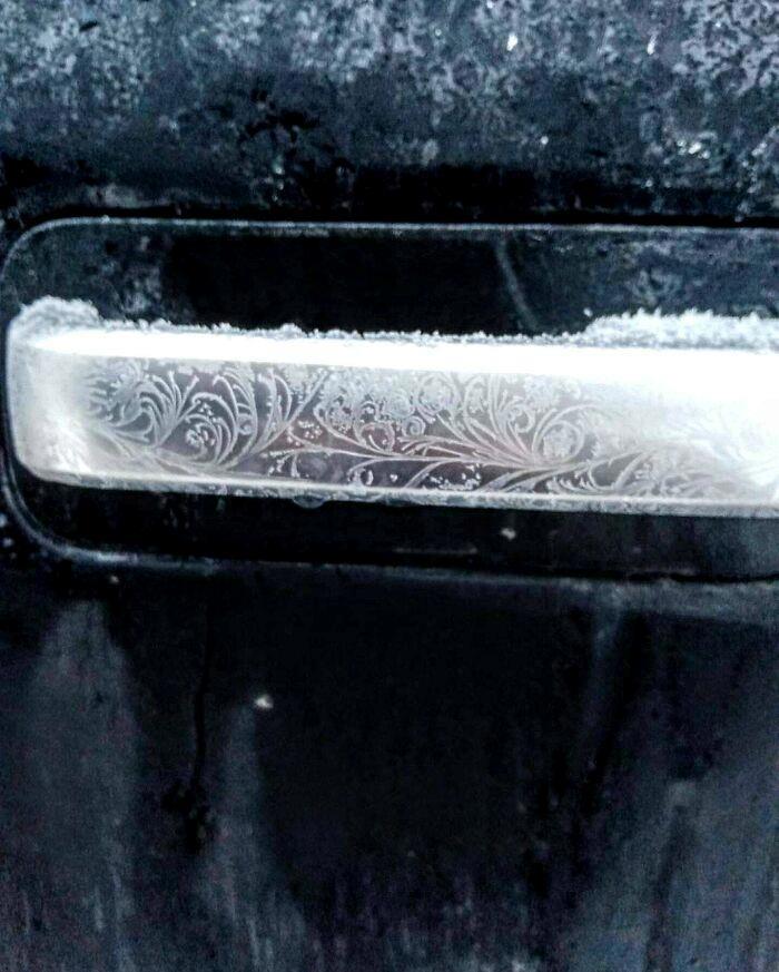 Красивый морозный рисунок на двери автомобиля . Даже разрушать его жалко :)
