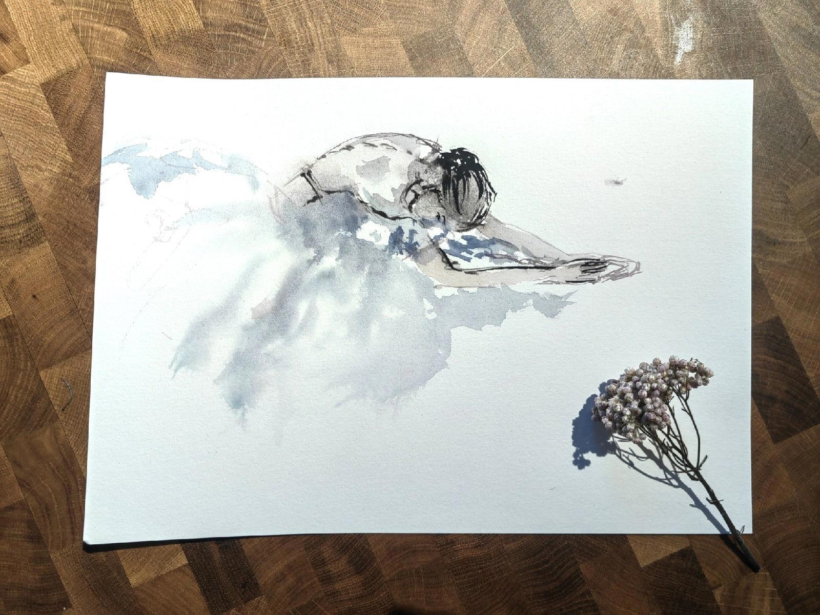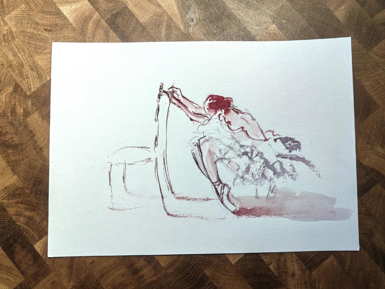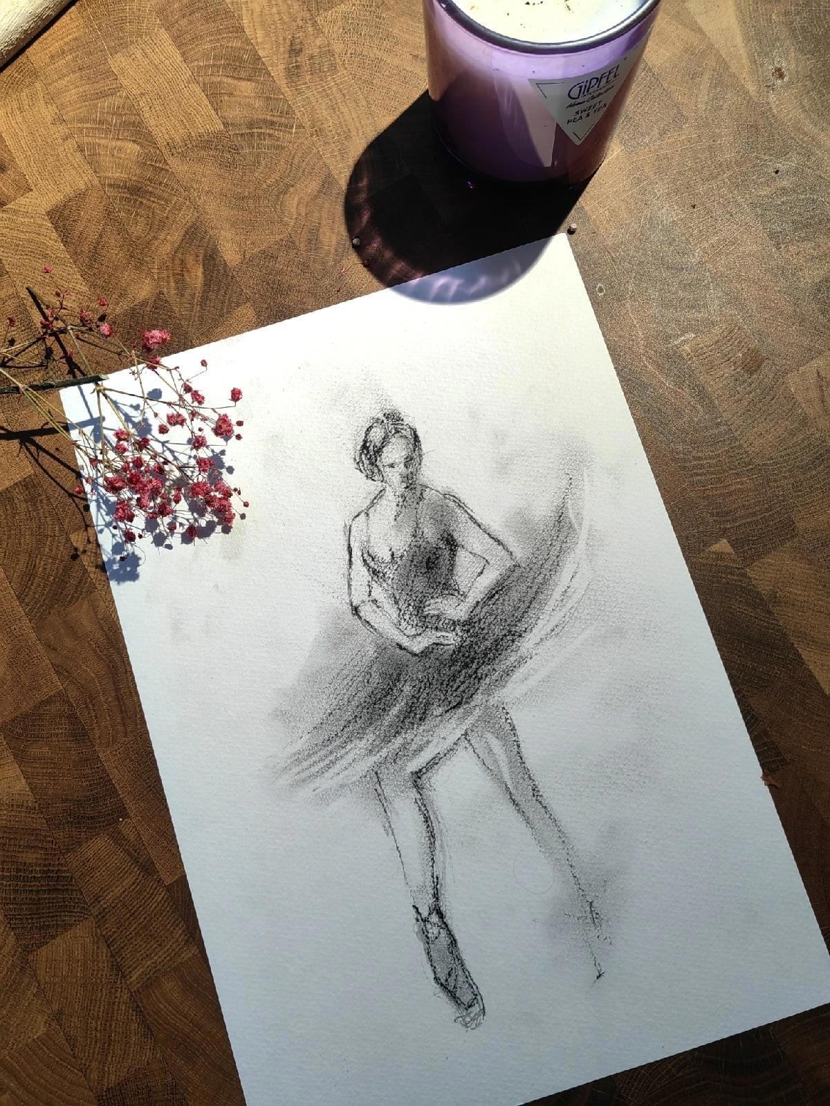 У организатора наших натурных классов есть подруга, занимающаяся балетом в качестве хобби. Она согласилась нам попозировать, за что ей большое спасибо, это было здорово! В следующий раз пригласим на более длительные постановки, 5 минут катастрофически не хватает. Лично я успевала накидать только общие пятна, но удовольствие получила непередаваемое!