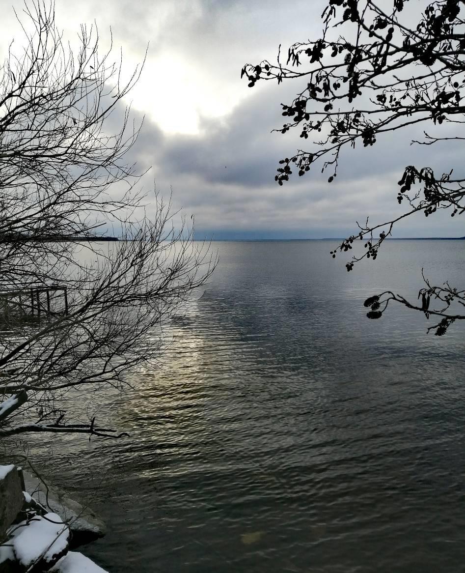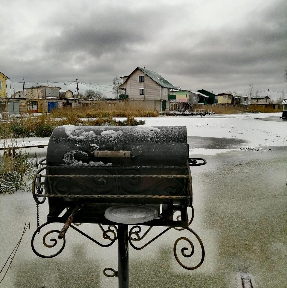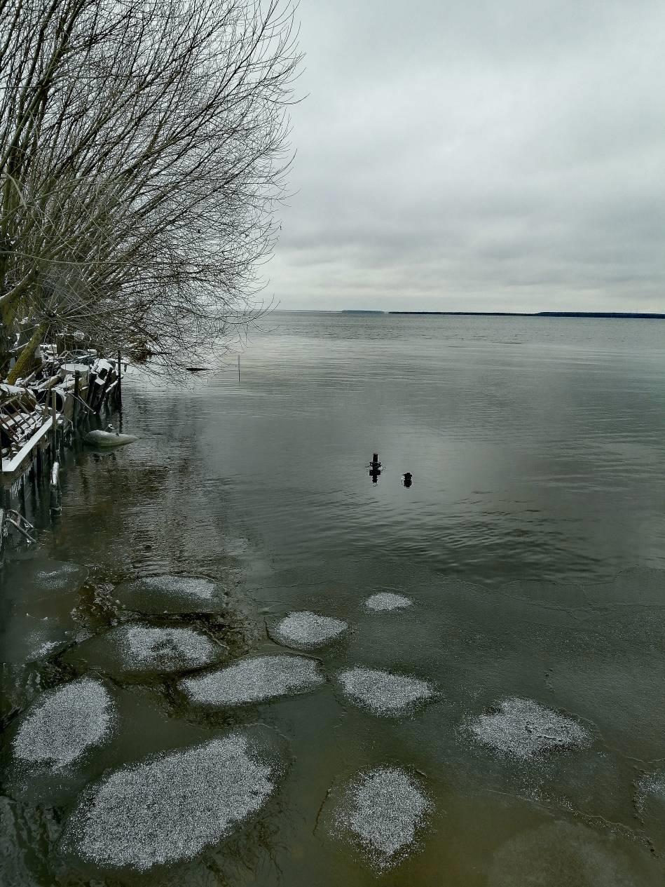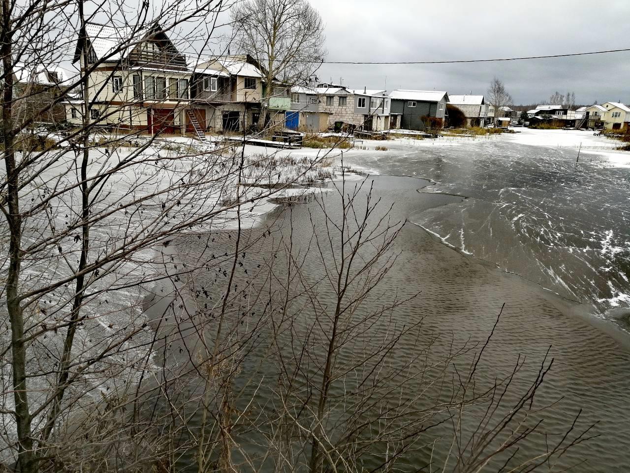 Каналы, ведущие к лодочным гаражам, замёрзли, а акватория ещё жидкая. Вроде потепление на следующей неделе отменили, но мороз невеликим ожидается. Так что вода пока властвует.