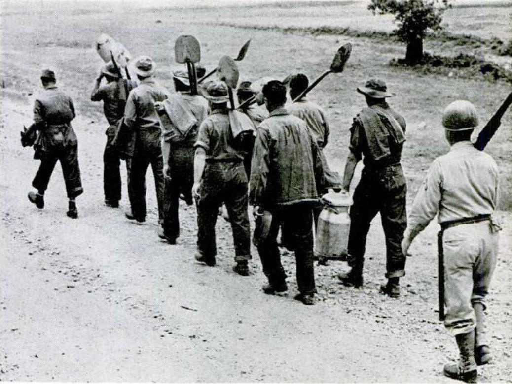Взвалив на плечи лопаты вместо ружей, отряд нацистских заключенных марширует с пением из лагеря на работу. Хотя большинство военнопленных упрямы, высокомерны и горды, они реагируют на вооруженную силу с величайшим почтением.
