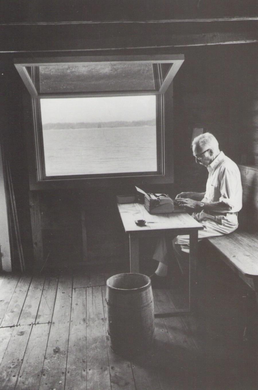 15) Американский писатель Уайт Элвин Брукс на своем прескромнейшем рабочем месте с видом на воду.