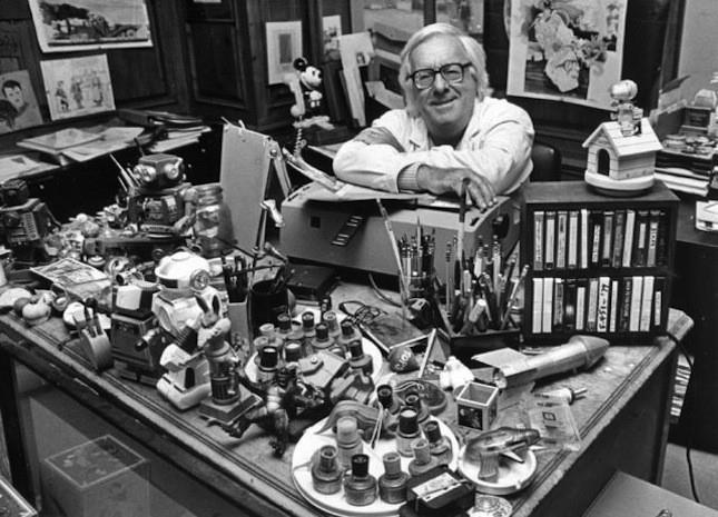 19) Рабочий стол Рэя Брэдбери язык не повернётся назвать «письменным». У фантаста был огромный стол. Но писал он, притулившись со своим компьютером на самом краешке, потому что весь стол был заставлен «очень важными вещами» – красками, модельками роботов, статуэтками, карандашами и видеокассетами.
