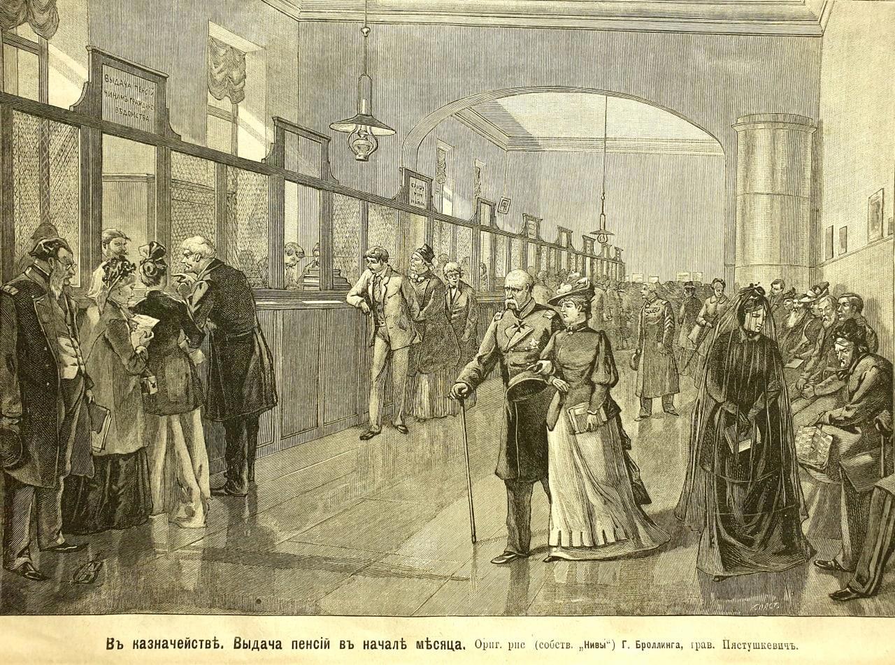 «Для того кто незнаком с пенсионным делом Главного Казначейства конечно интересна картинка срочных получений пенсии ветеранами государственной службы, особенно в начале месяца, когда скопляется здесь масса народу. В длинной галерее второго этажа, выходящей окнами на Кирочную улицу, толпятся тогда целые тысячи мужчин, женщин, больных, большею частью старцев, девушек, чуть не детей, с доверенностями от немощных родителей, военных с поперечными погонами, на костылях, и штатских. Все спешат пробраться поближе, каждый к бухгалтеру того ведомства, в котором протекла их служба. Бухгалтеры помещаются за решетками, впрочем еще недавно устроенными, завалены они пудовыми регистрами, и после разных сложных отметок и в регистре, и в пенсионной книжке вручают эту книжку пенсионеру. Выдача денег производится также в нескольких кассах. Длинною вереницею тянутся получатели один за другим, медленно продвигаясь вперед, в ожидании очереди. У кассира опять отметка, приложение штемпеля и передача причитающихся денег, стоящему рядом счетчику, который, проверив кредитки, вручает их наконец по назначению.