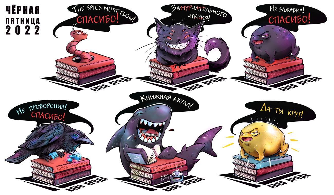 По уже традиции, для акции Helga Wojik нарисовала пак чибиков. Выдаваться они будут на стену читателя за покупку с любой наградой. Или же просто за награду от 50 рублей. Любым автором из списка, в порядке очереди, от книжного червя к золотой жабе. Те для того, чтобы собрать их всех, нужно купить с наградой любые шесть книг из участвующих в акции.