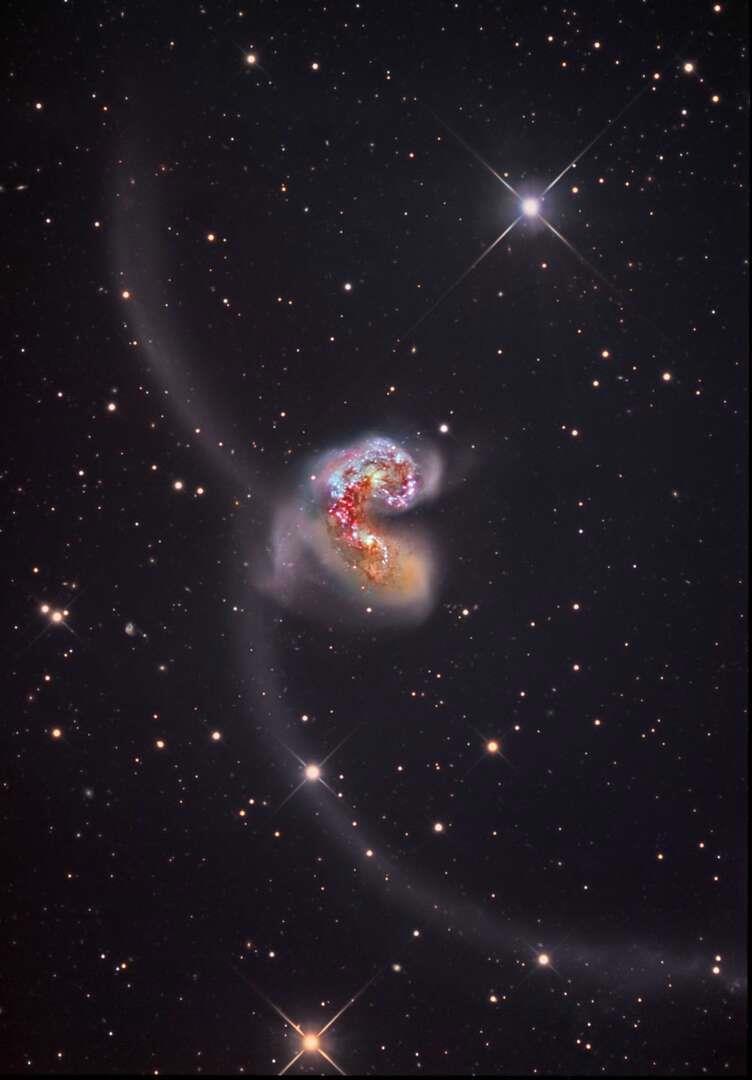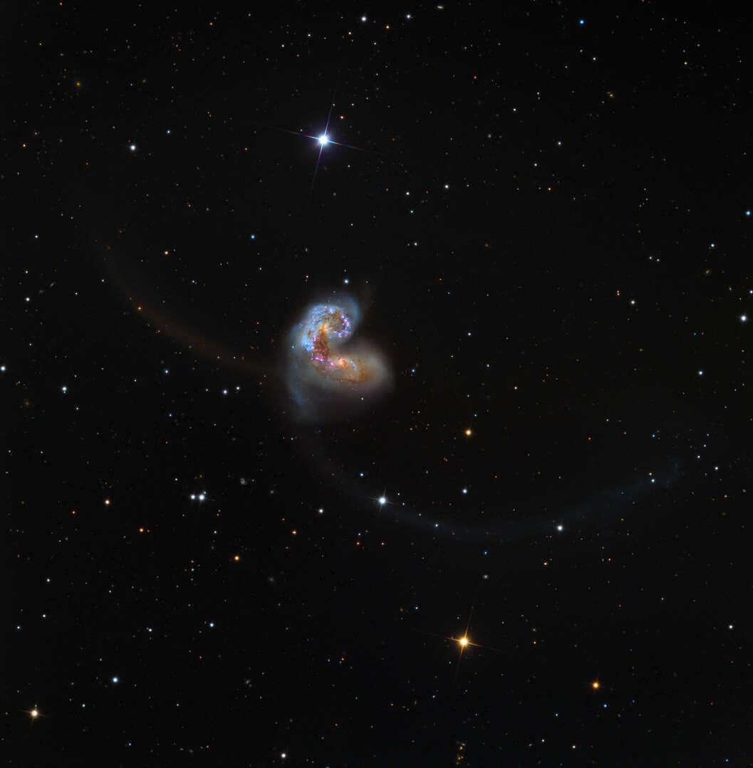 Две сталкивающиеся галактики находятся примерно в 62 миллионах световых лет от Земли. НАСА/CXC/SAO/J. ДеПаскуале/JPL-Caltech/STScI