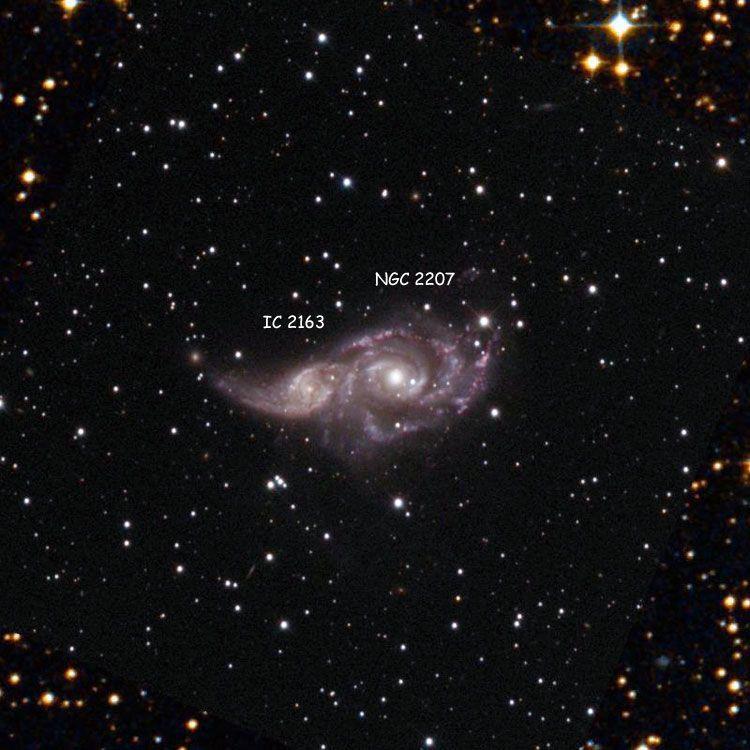 NGC 2207 (слева) и IC 2163 (справа) находятся примерно в 130 миллионах световых лет от Земли. НАСА/CXC/SAO/S. Минео и др./STScI/JPL/Caltech