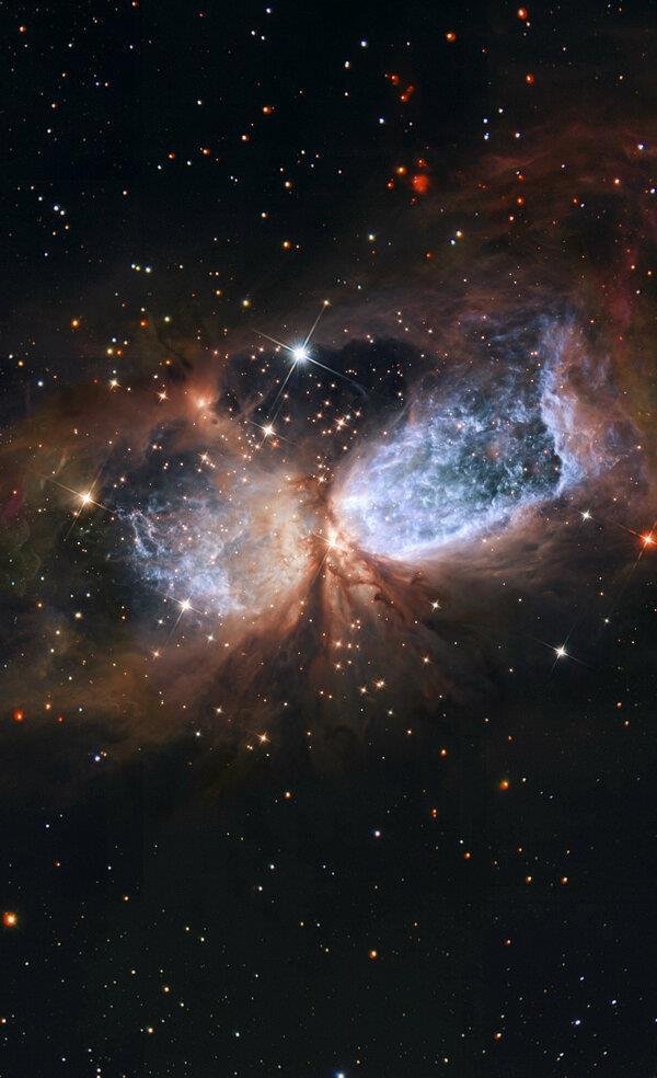 Новорожденная звезда, которой всего сто тысяч лет, выбрасывает вещество, формируя туманность под названием Шарплесс 2-106 (S106), изображенную на этой фотографии. Широкий диск из газа и пыли вокруг