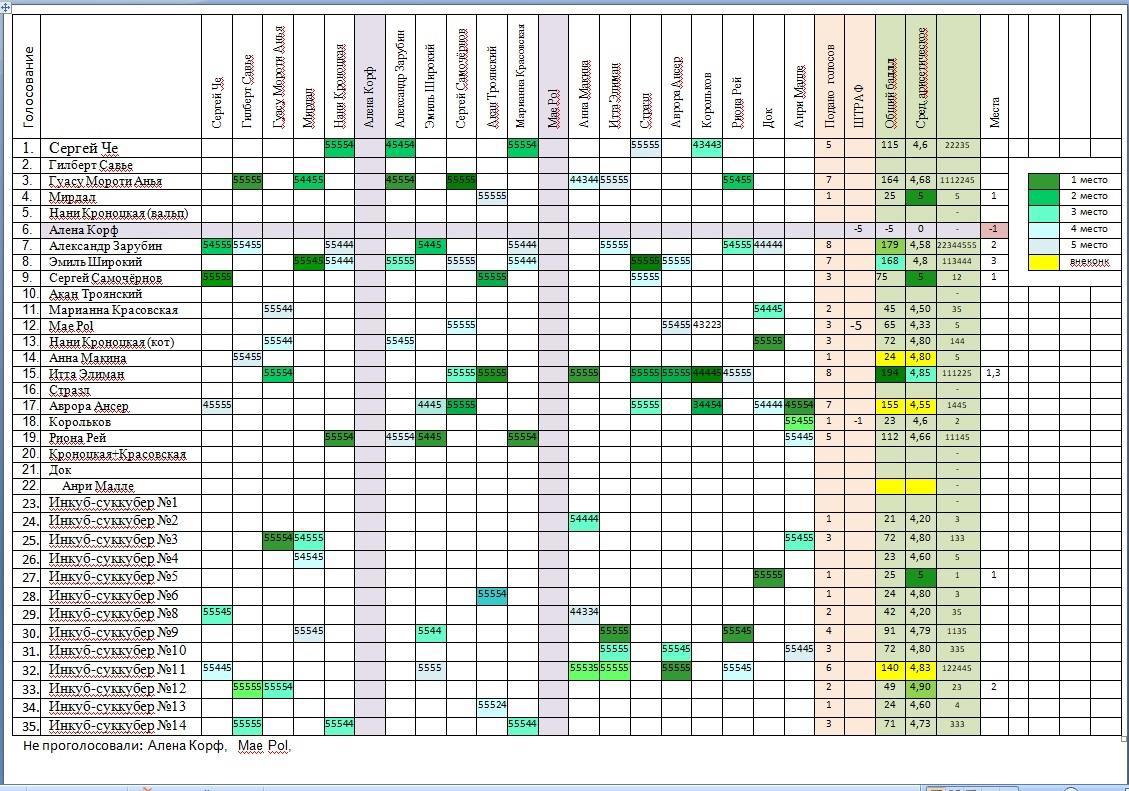 В подсчете учтены как личные расстановки рассказов по местам , так и еше четыре параметра: количество поданных за рассказ голосов, общий балл, средний балл, присуждавшиеся места.