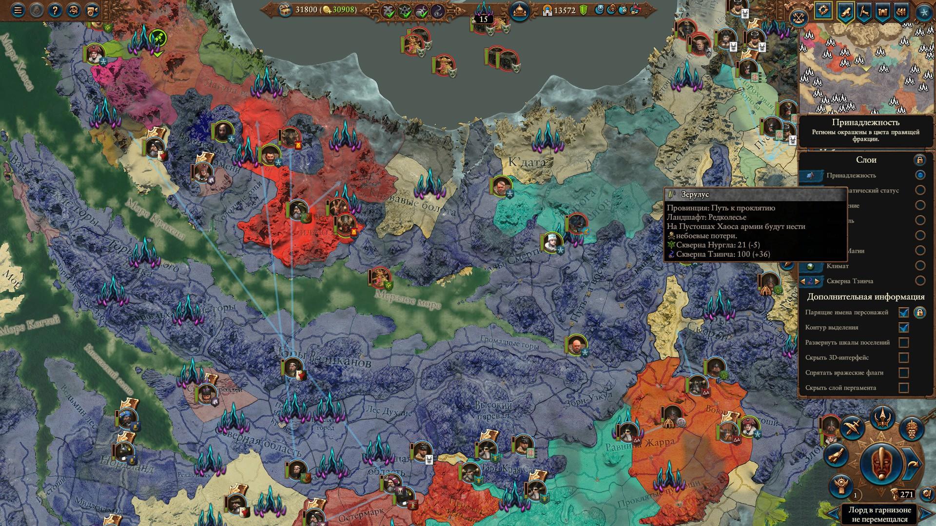 Объясняю: порталы в царства Хаоса открываются на 15 ходов. Зайти в них может только лидер фракции. Скорее всего, за один заход получится пройти лишь одно царство. Ну ладно, допустим, Слаанеш и Кхорна/Нургла получится проскочить быстро. Но на Тзинча придется потратить все отпущенное время. А значит, минимум три похода нам обеспечены.