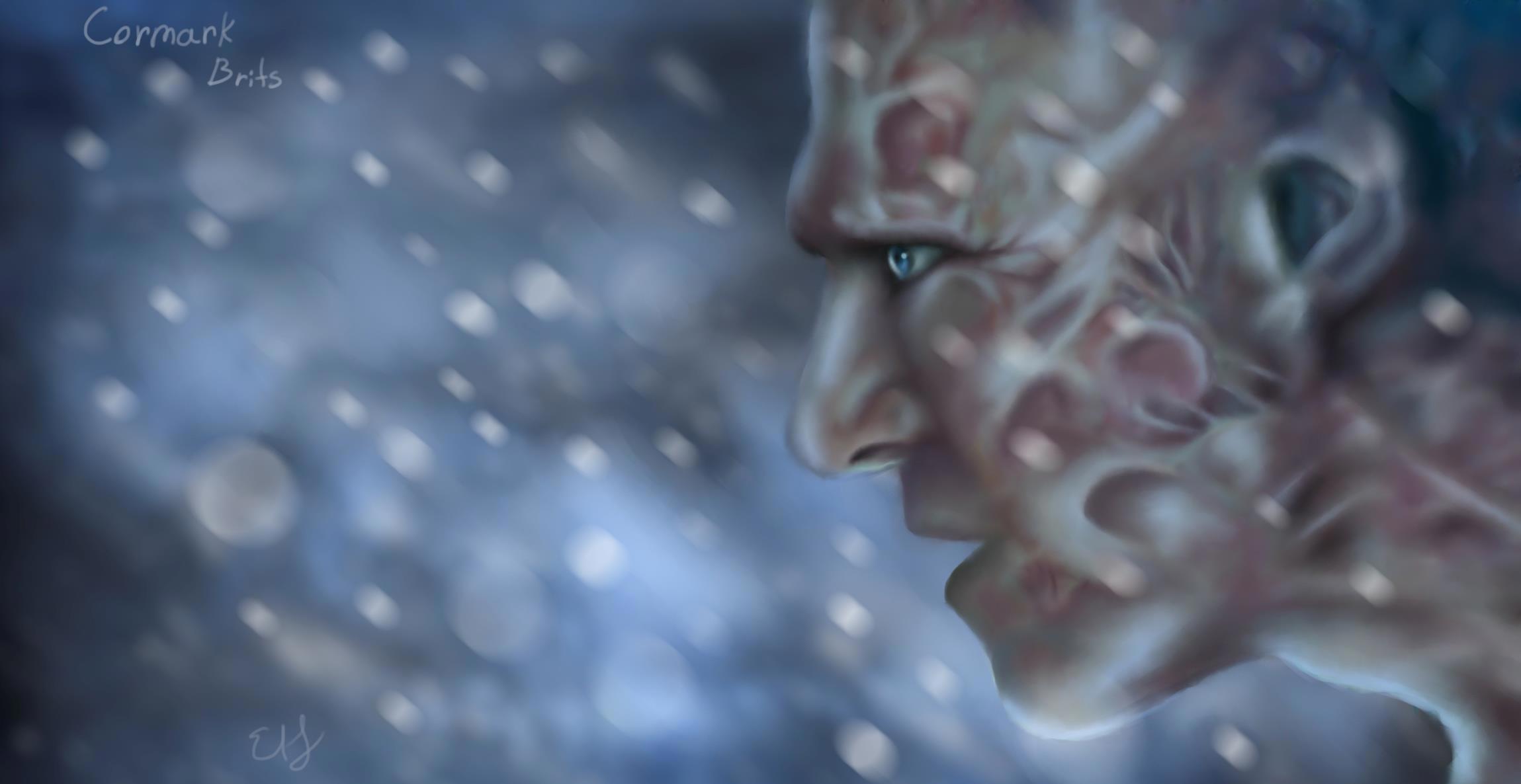 По поводу наследного принца... Если честно, я пыталась неоднократно его нарисовать, но это вызывает у меня некоторые трудности. Отчасти потому что он весь обгоревший из-за оплошности своей матери. Волос нет, ушей тоже. Зато есть магический дар сплетать огненные шары из воздуха. Представляю вашему вниманию: Кормарк Бритс.