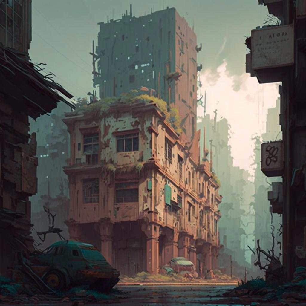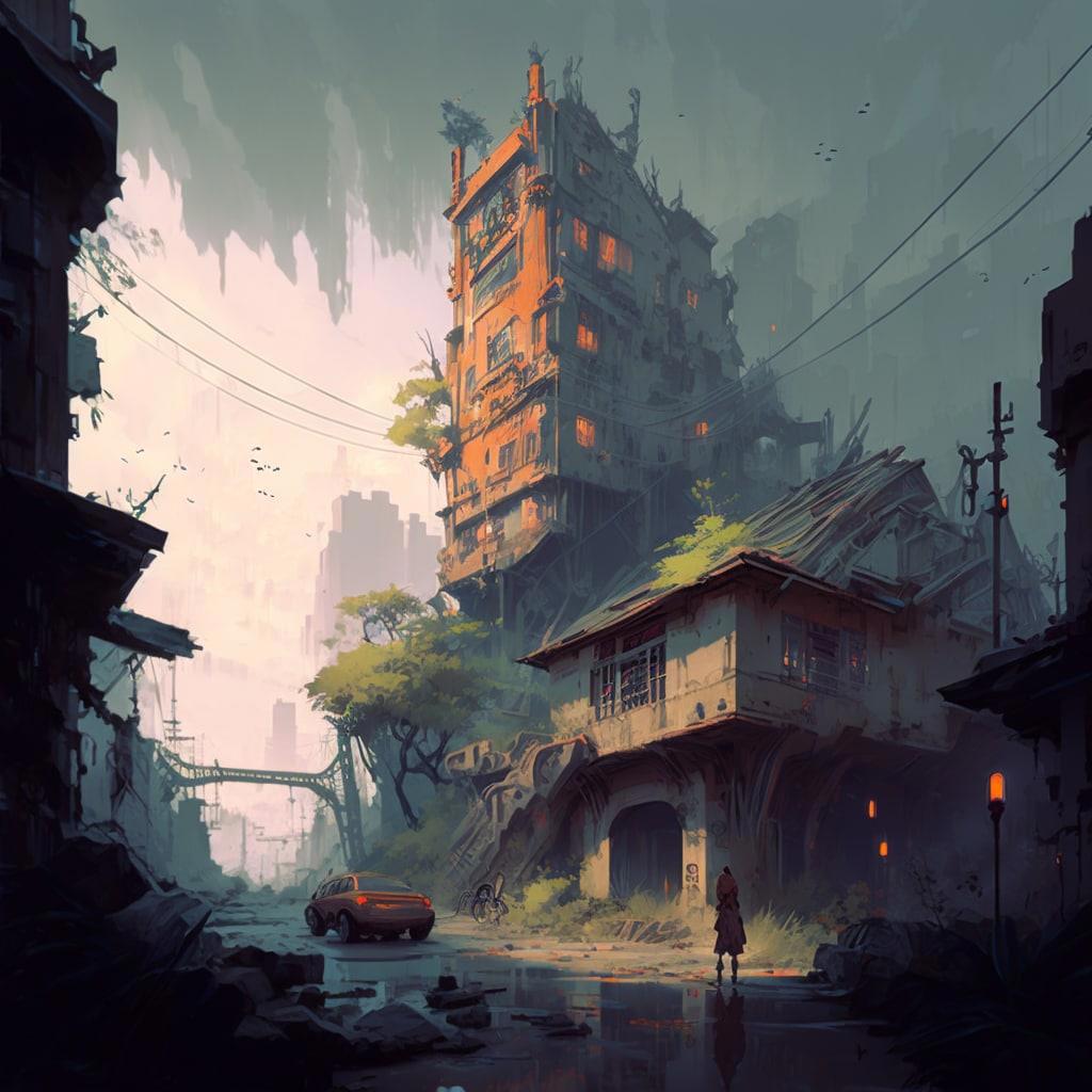 Ну и последнее - про фоны. Пейзажи постапокалиптического Транссиба и развалины близлежащих городов Midjourney рисует просто изумительно, хоть и с изрядной долей благородного безумия. Для фонов использовать - самое то.