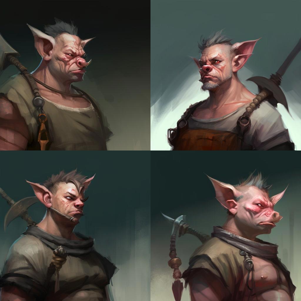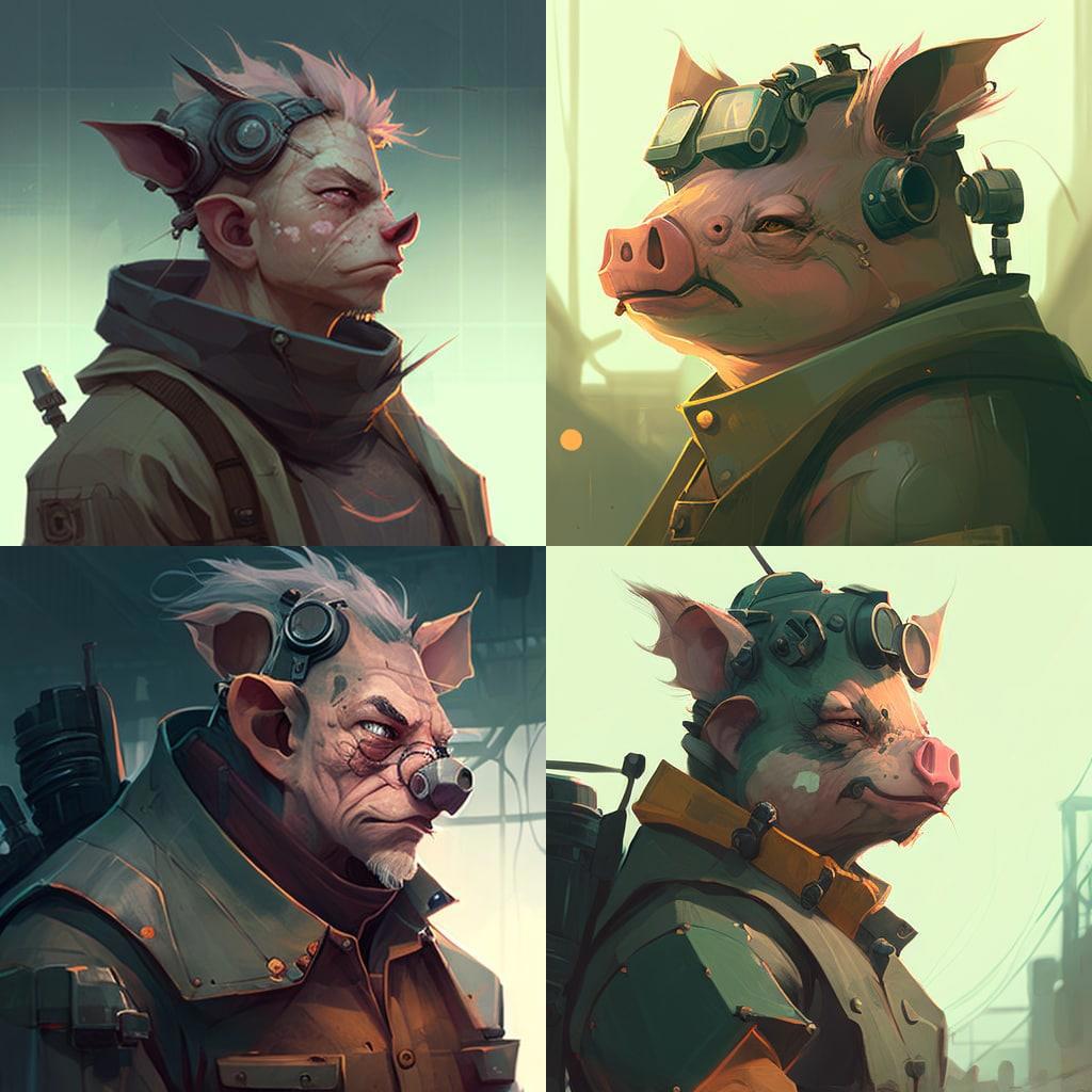 С Психом я ликовал, но когда мы перешли к следующему из паломников - Жиру, то бишь гуманоиду, развившемуся из свиньи - я в полной мере осознал еще один глобальный минут Midjourney.