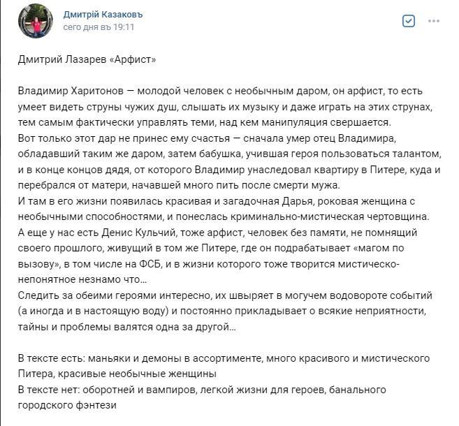 Автор: Лазарев ДмитрийОб Арфисте пишет Дмитрий Казаков, мастер литературных семинаров, в которых я участвовал. (см. прилагаемый скриншот). На роман тем временем продолжается подписка. https://author.today/work/231998