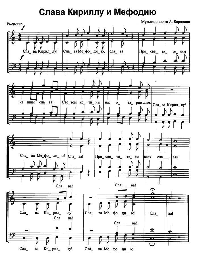 В наследии А.П. Бородина есть единственное православное духовное сочинение. Это причастный стих «Слава Кириллу, слава Мефодию». Когда оно создано, мне точно неизвестно, но предполагаю, что до «Князя Игоря». По стилю это скромное по размеру произведение напоминает партесный концерт: он был распространен в русской православной церкви во второй половине XVII в. и в XVIII веке. На это указывают характерные для партесного концерта черты: четырехголосие, контрастные сопоставления разных хоровых групп или какой-то одной группы со всем хором, а также небольшой масштаб. Но кое-что здесь заставляет вспомнить хор «Слава» из «Князя Игоря»: могучие «богатырские» унисоны, эпический склад музыки.