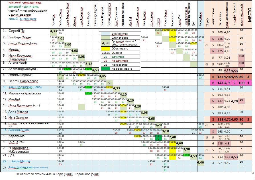 2. Расчет велся только по реально полученным оценкам, однако в финальном зачете само по себе количество полученных отзывов (3, 5 или более пяти) имело значение и учитывалось. Наличие нулей должно (по идее) заставить автора задуматься о причинах отказа голосовать.