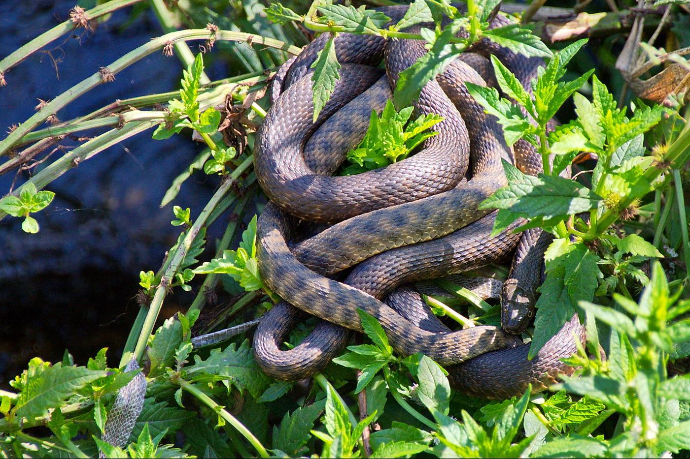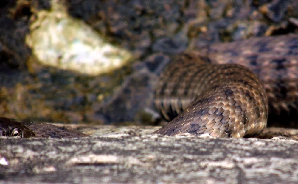 Напоследок два снимка ужиного кублишка - разные места, разные годы. Этот снят снова в нашей городской речке, и снимать мне в ней удобно, если действо происходит на бетонной закраине и персонажи не разбежались (расползлись, разлетелись) то расстояние буквально от пары метров до пяти-шести, объектив с хорошим зумом собирает неплохой урожай.