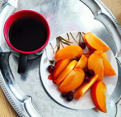 А я пью зимний горячий напиток из виноградного и смородинового сока и ем хурму с клюквой.