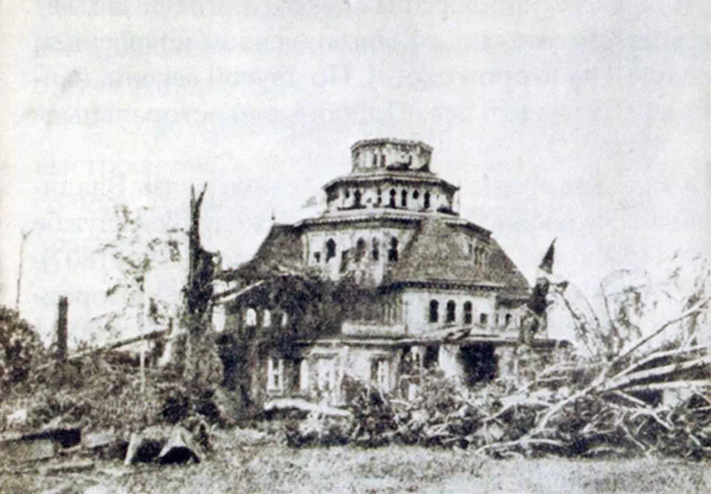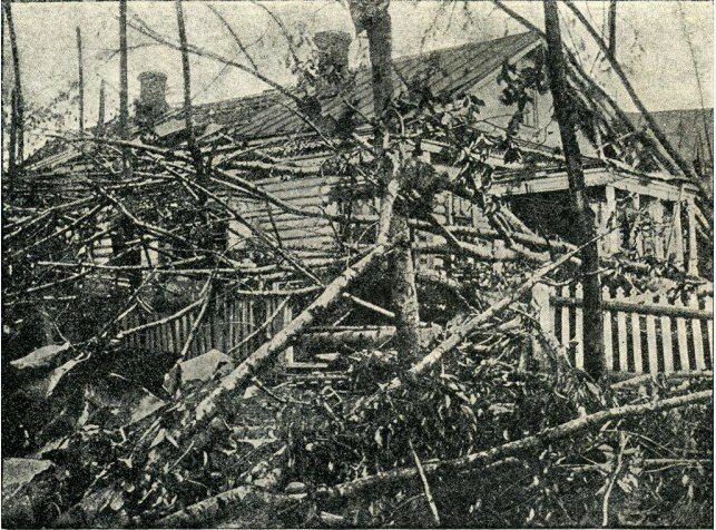 Солидный каменный забор, стоявший напротив меня, обрушился; вся улица была завалена обломками, деревьями, досками, кирпичами, железными листами. Я вышел из-под ворот и ахнул: громадная, массивная, толстая металлическая фабричная труба была согнута и вершиной легла на мостовую."