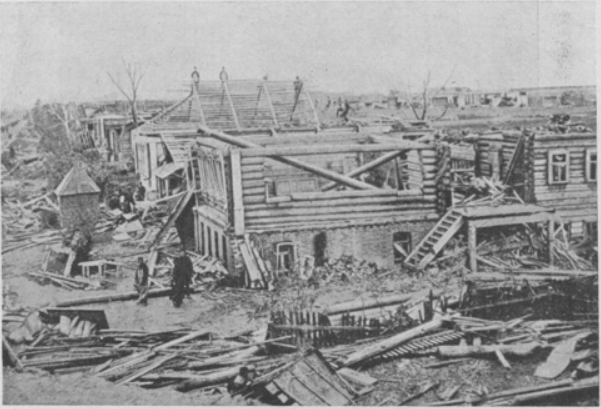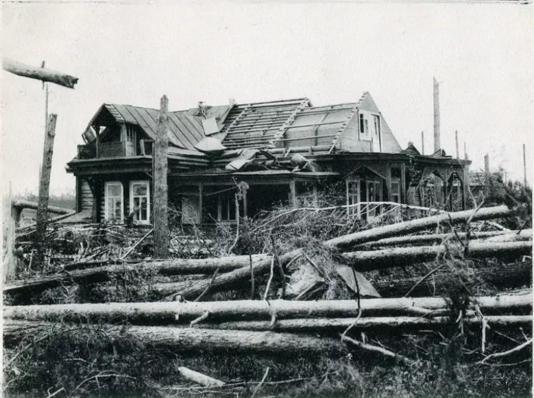 "Стало темно, и сверкали одни молнии. Мне стало страшно, и я спрятался в массивной каменной подворотне. В этот момент налетел такой вихрь, кругом пошёл такой треск, вой и грохот, словно небо обрушилось. Мимо меня вдоль улицы полетели железные листы с крыш, сломанные деревья, куски брёвен, доски, кирпичи, всякие обломки. Всё это продолжалось не более двух минут и сразу кончилось.