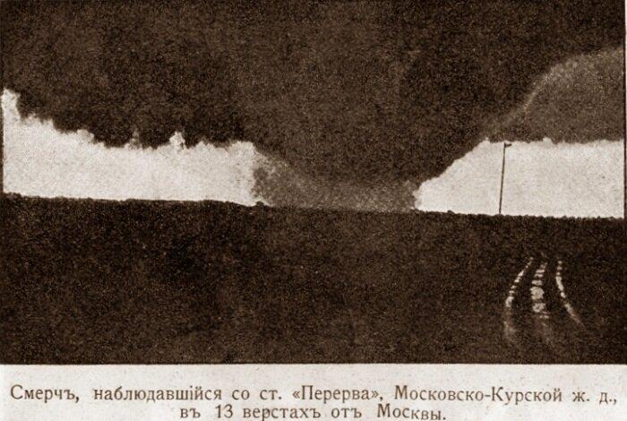 Некий господин Константинов сумел сделать фотографию смерча из окна вагона, когда его поезд стоял на станции Перерва Московско-Курской железной дороги.