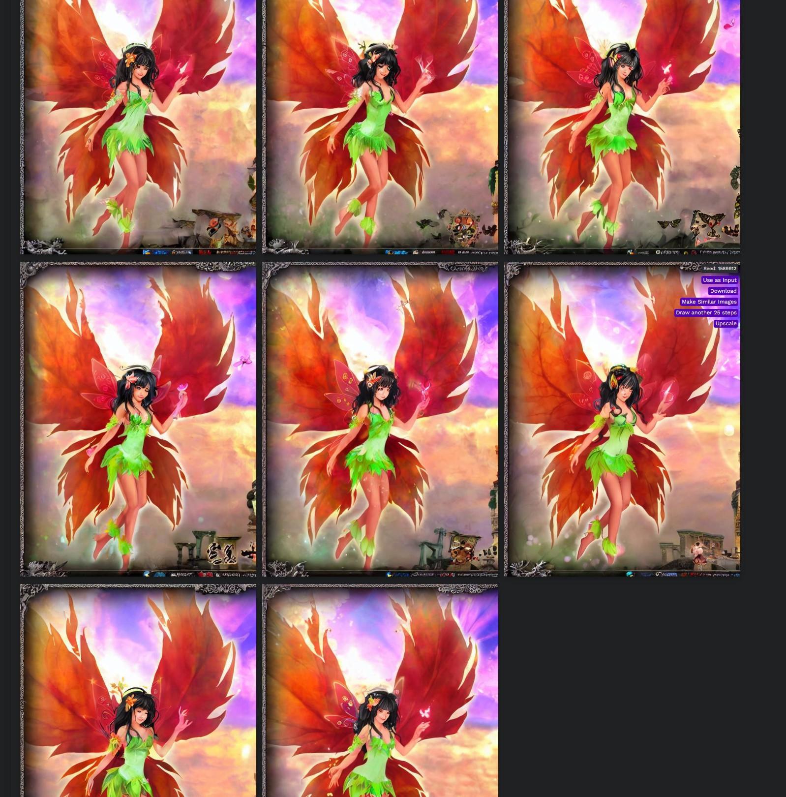 Я сидел больше часа генерировал разные варианты, регулируя степень похожести на образец, ключевые слова, настройки стилей. У меня получилось 32 вариации феи.
