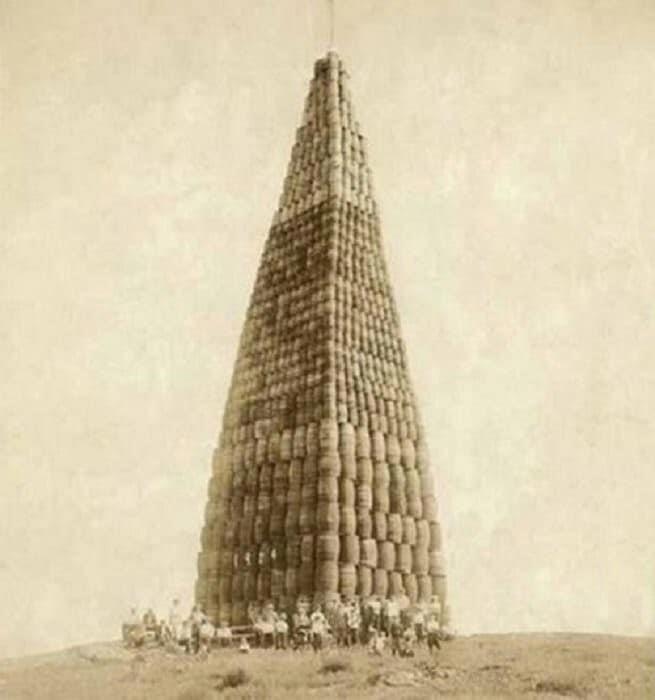 На дворе 1924 год – в США объявлен сухой закон. На фото запечатлена башня из бочек спиртного, подготовленная к сожжению для спасения нации от алкогольной напасти.