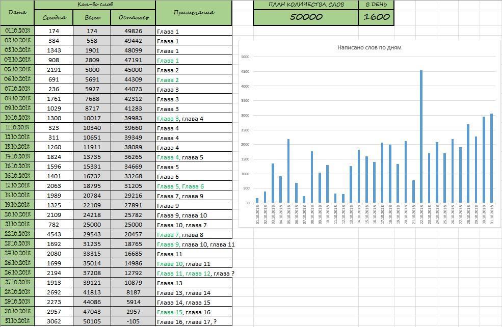 ️. В Клубе писателей-практиков к марафону каждый год делятся таблицей для подсчетов с графиком. Так удобно считать, сколько написал, сколько осталось, а еще можно видеть красивые столбики. Более того, я придумываю себе награды за промежуточные итоги. Например, за каждые 10 000 слов, потом за середину романа и отдельно за рубеж в 35 000 слов – интересно, но именно здесь чаще всего случается большой упадок сил. Чем сложнее рубеж, тем ценнее подарок. Иногда это вкусняшки, иногда долгожданная покупка, иногда писательский выходной или просто день приятного времяпровождения.