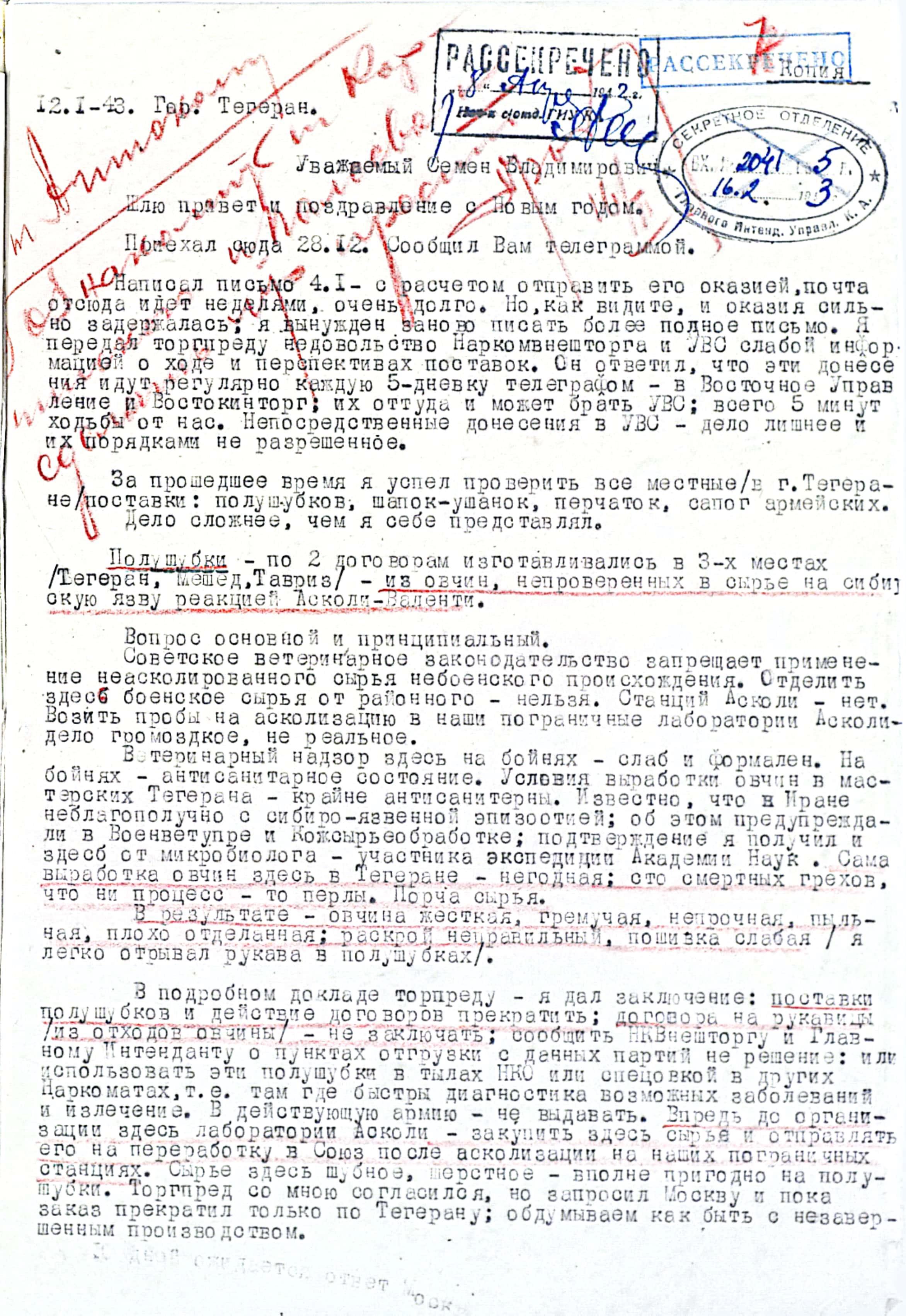 Письмо из Торгпредства Ирана. Январь 1943 г.