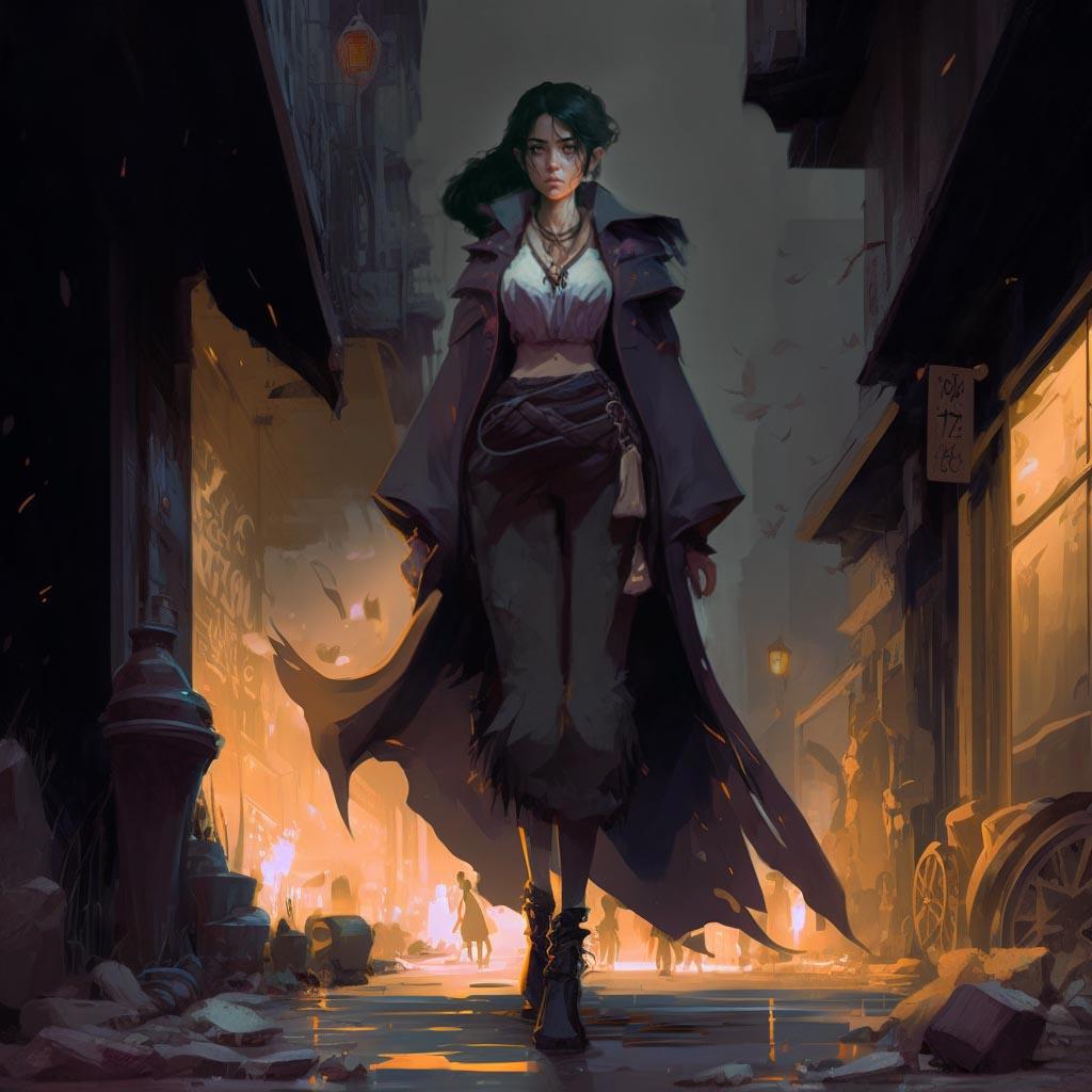 Вот картинка «молодая ведьма идет на фоне пламени», заказанной мне для обложки одной писательницей. В итоге она выбрала другую картинку, так что эту приведу как пример.