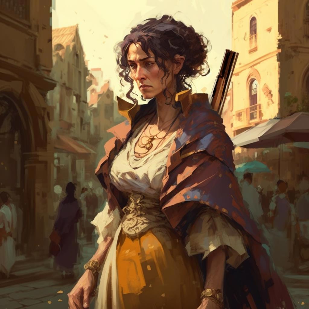 Я уже упоминал, что проблемы с определённым оружием у персонажа – пока она этого на может. Получается «палка-стрелялка», не более. Вот еще одна картинка, сделанная на заказ «женщина в средневековой одежде, в средневековом городе, но с двустволкой за плечом». Здесь ружье взято с другой картинки, потому что сгенерить с приемлемым качеством не получилось. Заказчик в итоге выбрал другую, так что могу показать:
