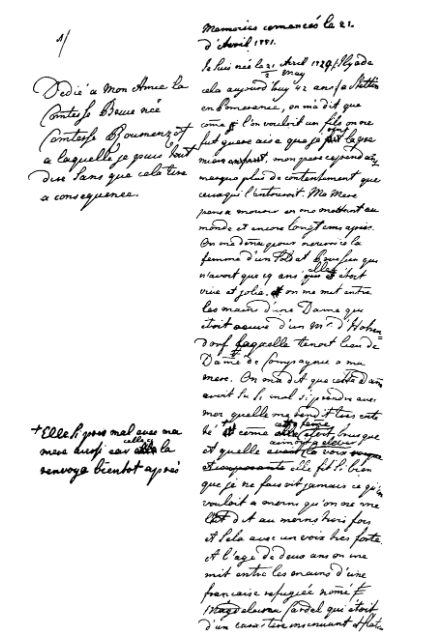 После этого Екатерина обратилась к написанию собственных мемуаров. Сохранилась оригинальная рукопись черновика значительной части этих автобиографических записок.