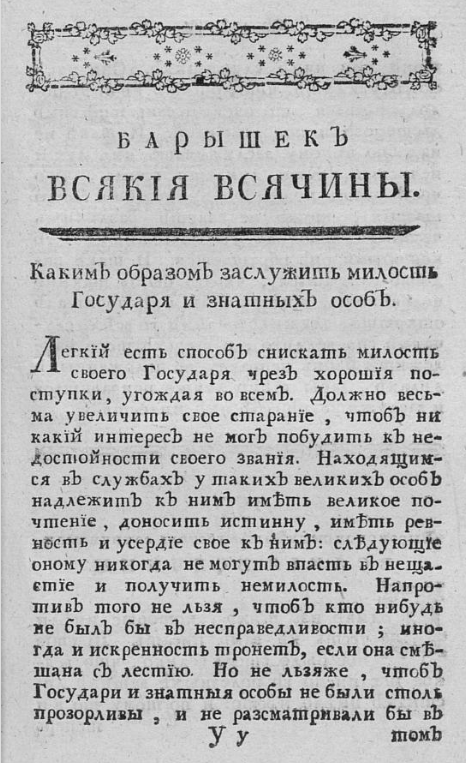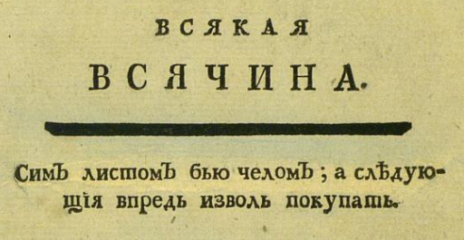 Автор: Д. В. АмурскийВ начале января 1769 года в Санкт-Петербурге вышло новое печатное издание, которое называлось "Всякая всячина". Первый его номер на шести страницах, отпечатанный в количестве 1692 экземпляра, распространялся бесплатно: