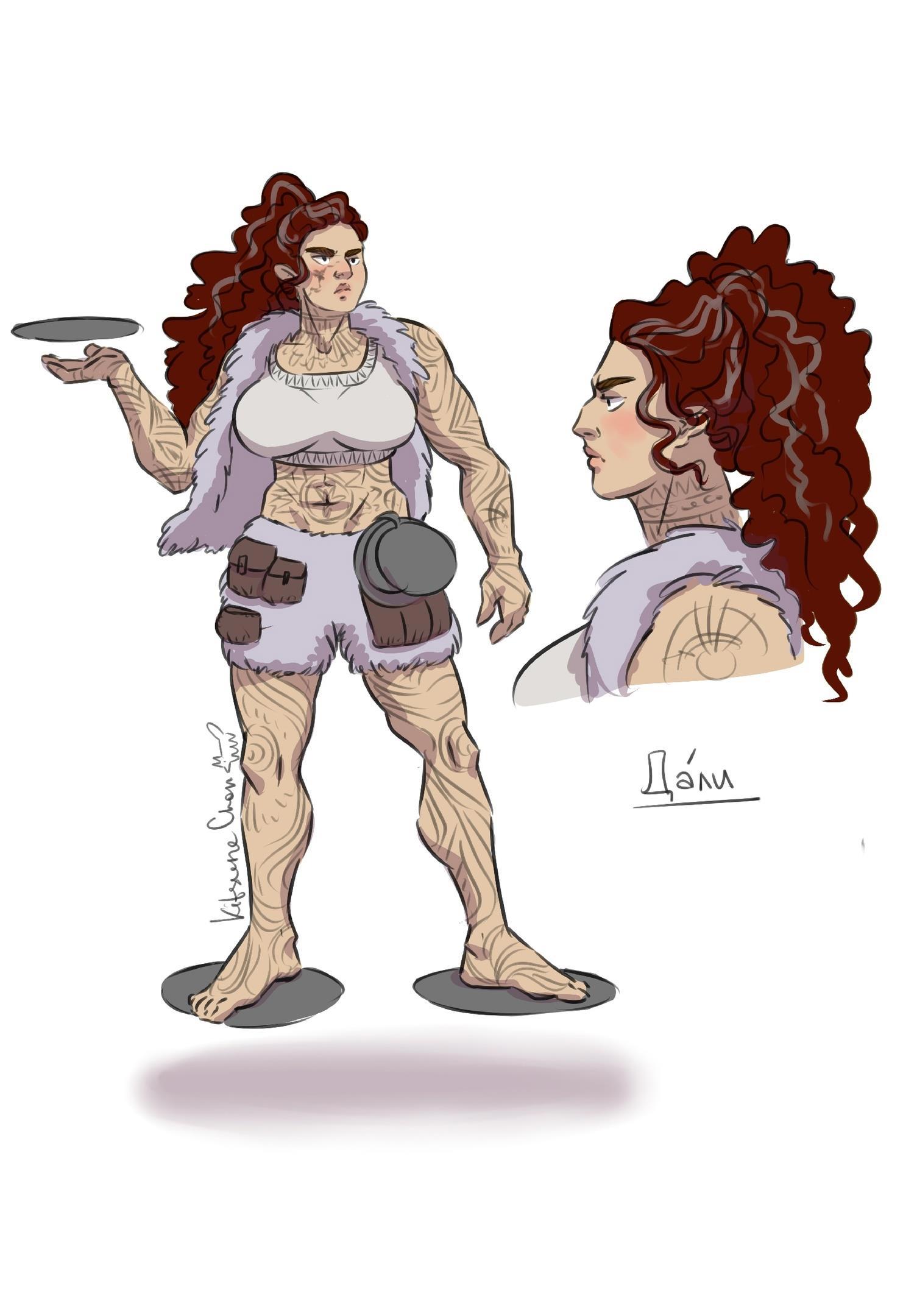 И начнем с Дали Снежницы, "Почитающей, рожденной под рукой Севера, принятой в Клан, чрево его, слышащей лед" (с). У художницы стояла задача изобразить суровую крупную женщину, с сексуальностью близкой к картинам художника Бориса Вальехо, работы которого часто украшали сборники фантастики. По-моему, она отлично справилась.