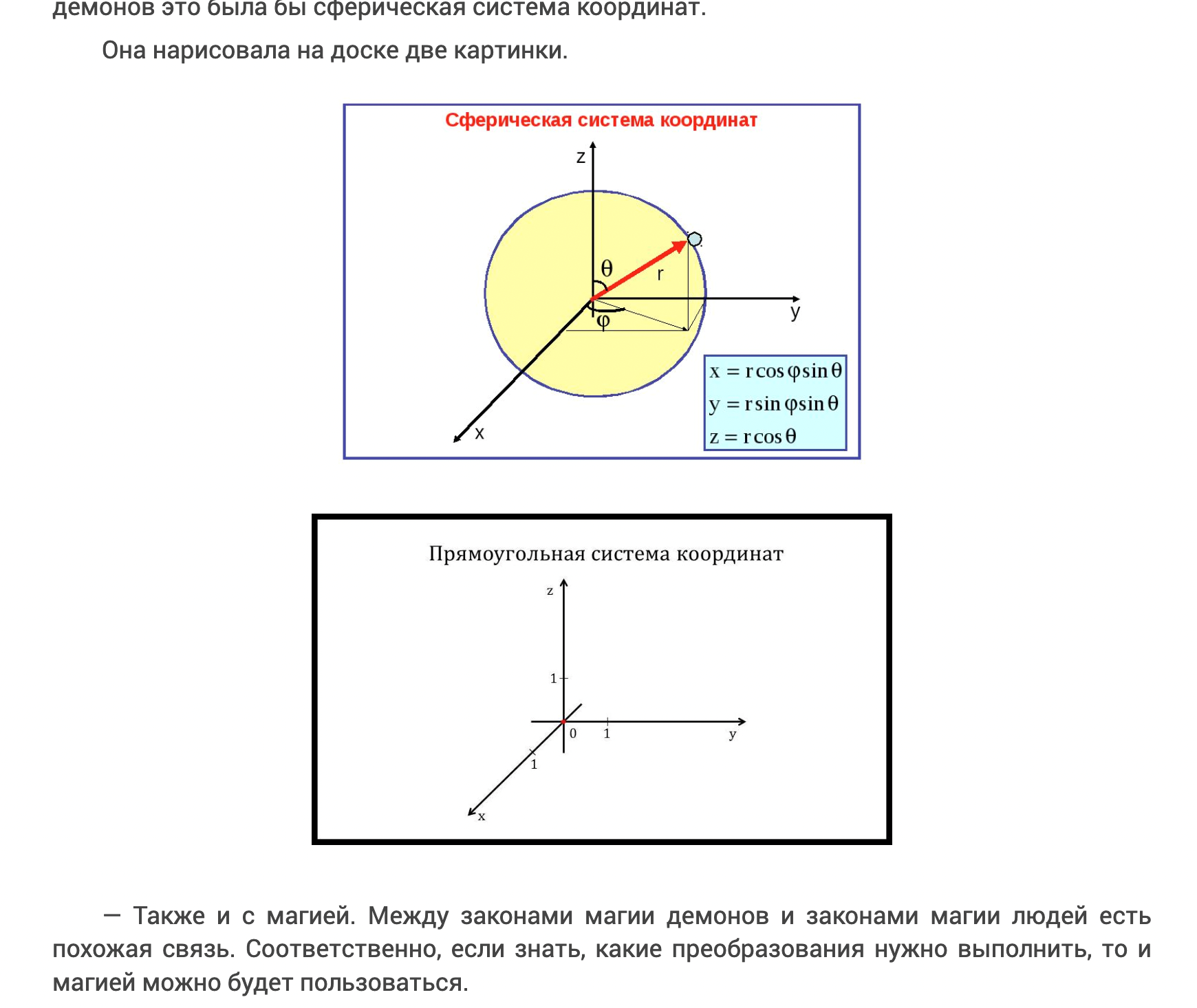 // На самом деле, я несколько лет жила с мыслью о том, что в магии, которая создает порталы, не может не быть бешеной математики. А сама идея про связь двух миров по аналогии прямоугольной и сферической координат зародилась еще на втором курсе института.