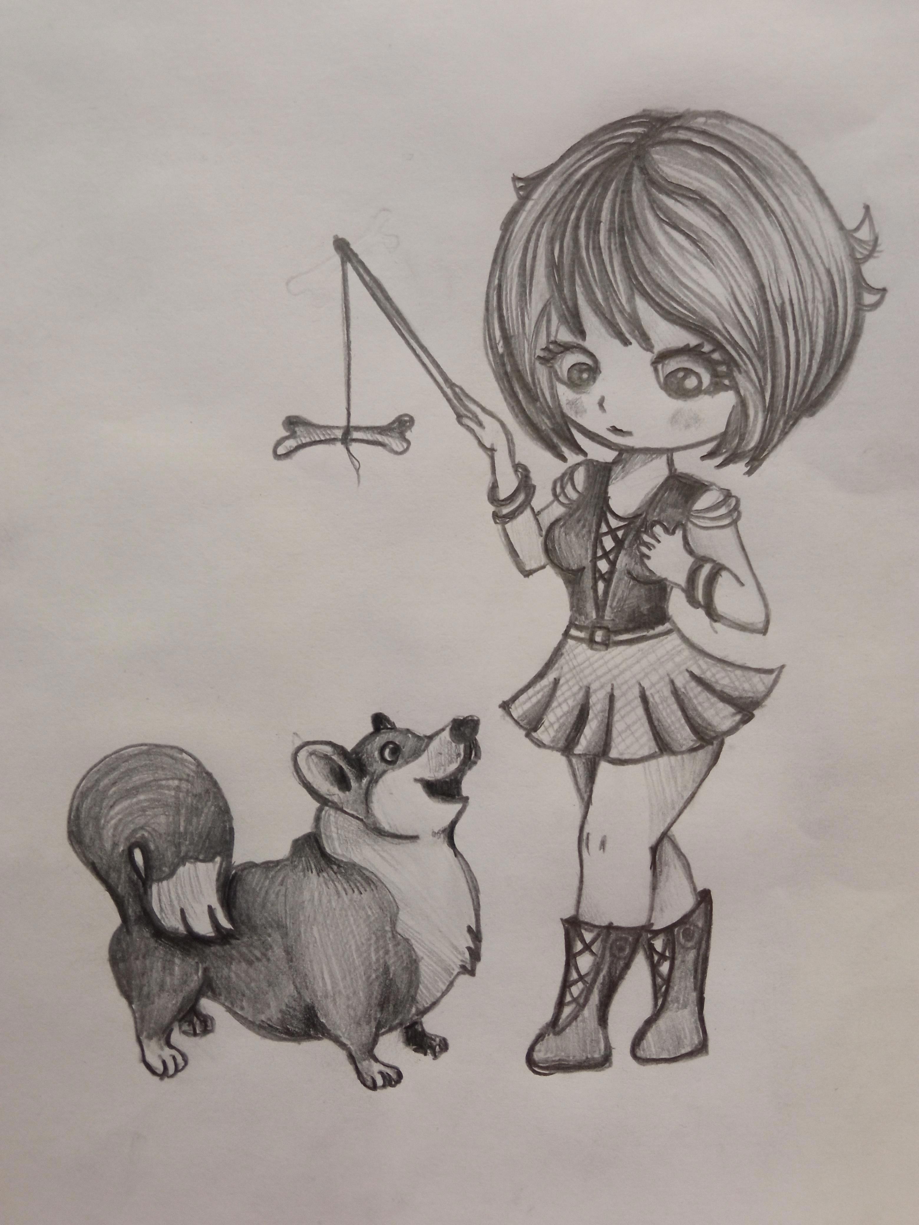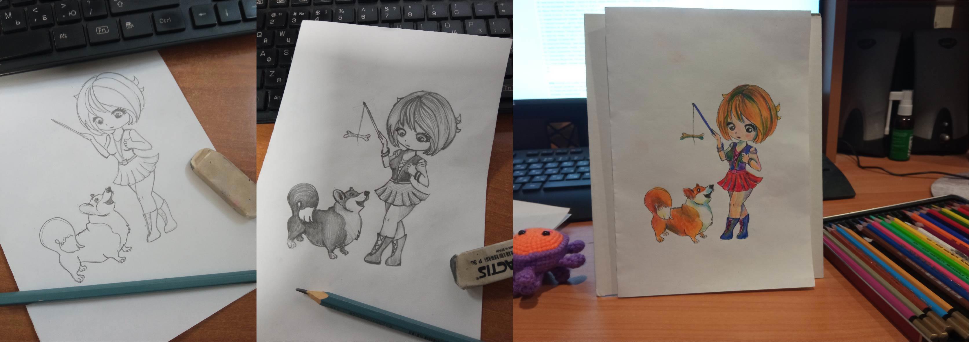 Сделала несколько ксерокопий на рабочем принтере и попыталась по-разному оформить рисунок - в простом карандаше и в цвете (был еще вариант фломастерами, но там такой треш, даже показывать не буду). Рисовашки руками у меня не очень выходят, к сожалению. Собака только норм получилась)))