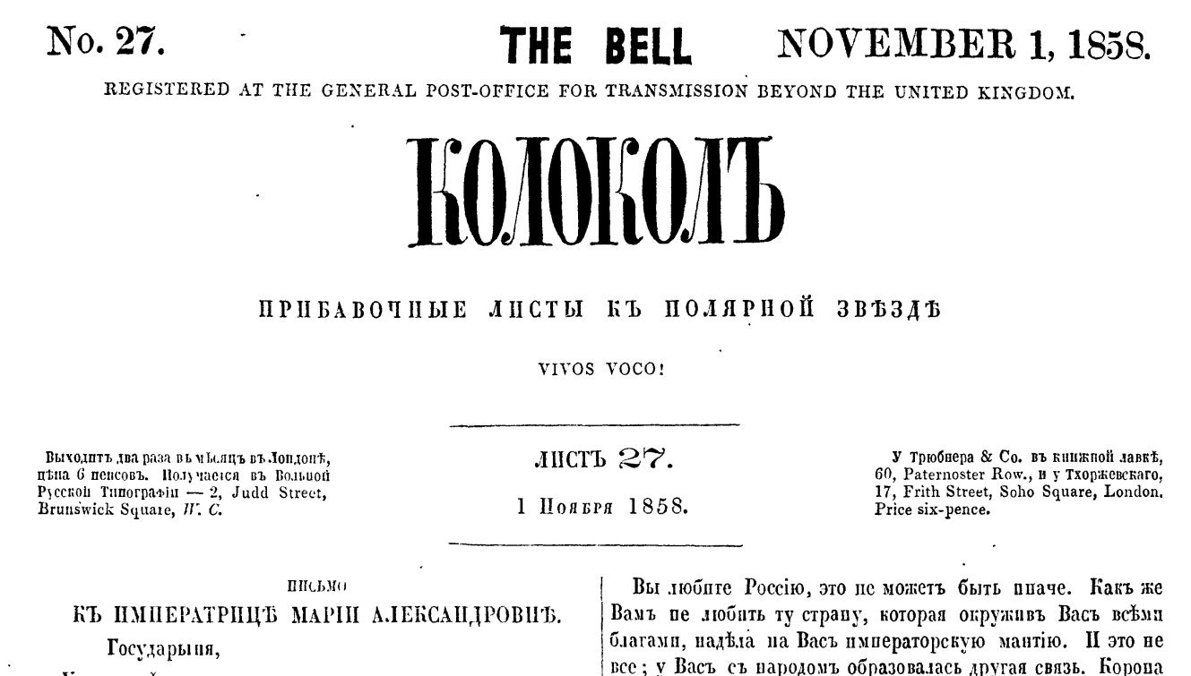 «Колокол» был открыт на статье под названием «Письмо к императрице Марии Александровне», которая начиналась со слова «Государыня».