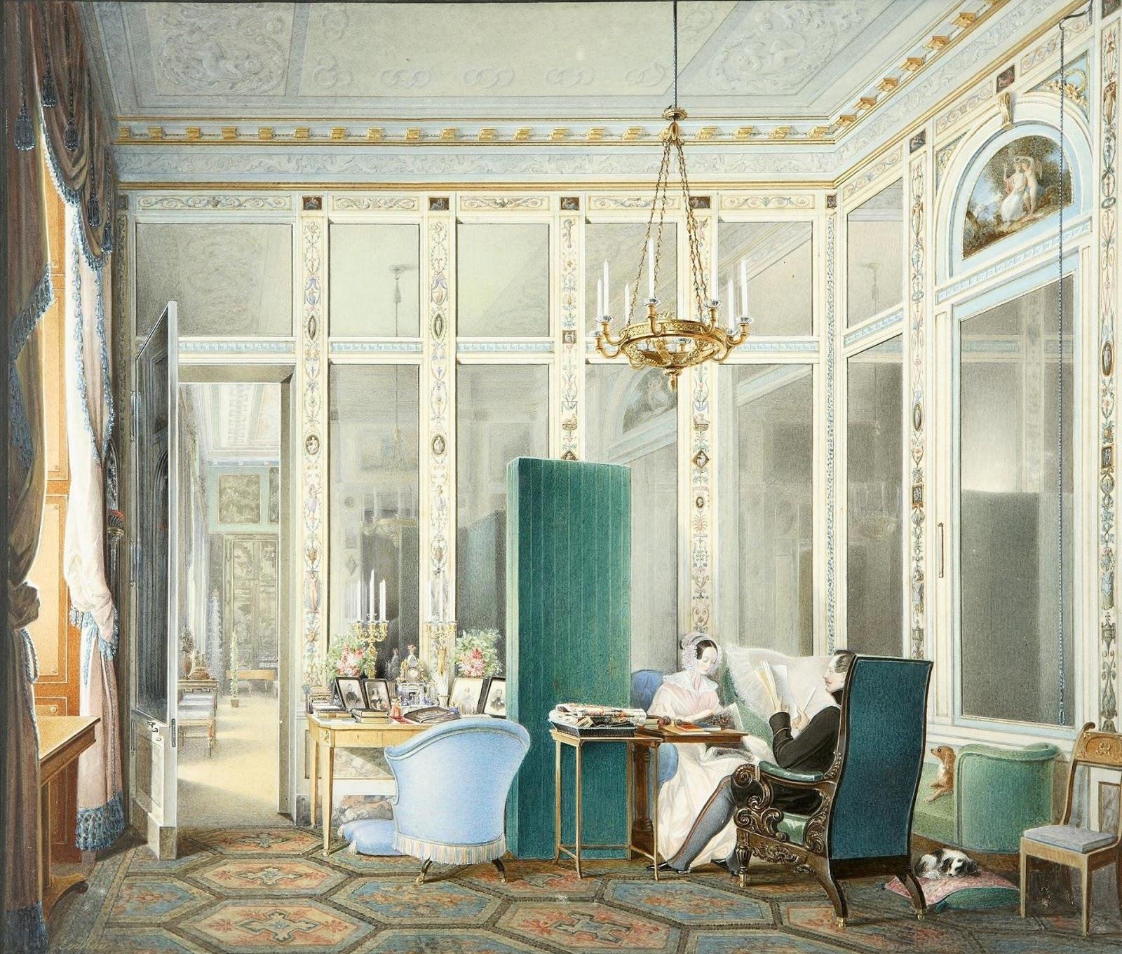 Мама́ сидела на ментолового цвета диване и была как-то особенно прекрасна. Рядом с ней на краешке пристроилась Тютчева и сочувственно смотрела на государыню.