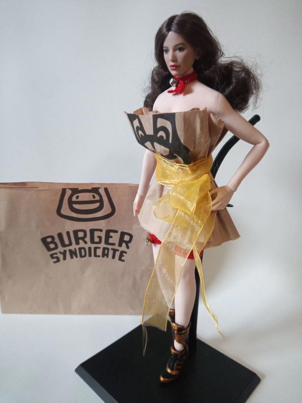 Сейчас я одела её в пакет своей любимой бургерной, пока не подобрала или сшила всё необходимое для косплея и кажется, что это удачный экспромт, но нет. Идея персонажа, девушки инвалида без обеих рук, опаздывающей на свидание и пришедшей в обёрточной бумаге, перевязанной бантом осенила меня ещё месяц назад. Кто знает, может руки поднимутся описать и эту историю. Конечно, не хотелось бы отрезать кукле лишнее ради косплея этой героини, но посредственные навыки фотошопа пригодятся, думаю. Так же скажу, что зовут её "Погремушка", потому я очень удачно в швейном магазине встретила такие маленькие бубенчики и с радостью купила. И она должна быть лысой... В общем не в ту сторону я вроде как работаю. Писать нужно, но прошивая золотой ниточкой тонкую красную полоску мне становилось заметно легче, а фантазия даже позволила себе понаблюдать за процессом из пещерки.