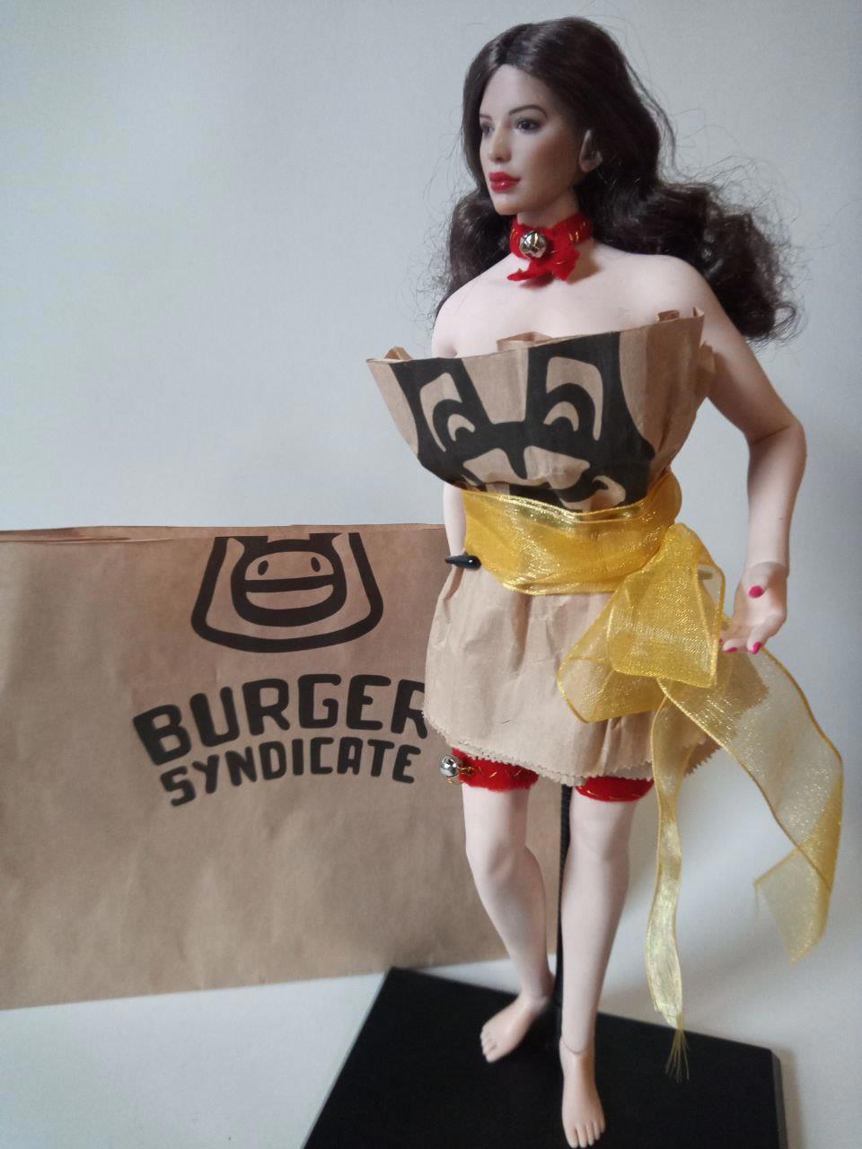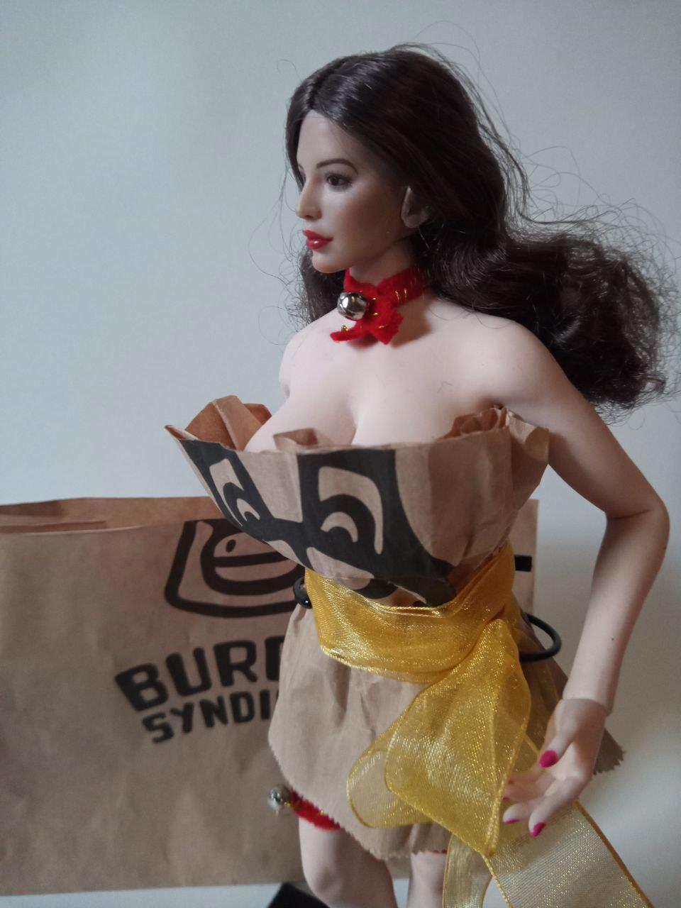 Сейчас я одела её в пакет своей любимой бургерной, пока не подобрала или сшила всё необходимое для косплея и кажется, что это удачный экспромт, но нет. Идея персонажа, девушки инвалида без обеих рук, опаздывающей на свидание и пришедшей в обёрточной бумаге, перевязанной бантом осенила меня ещё месяц назад. Кто знает, может руки поднимутся описать и эту историю. Конечно, не хотелось бы отрезать кукле лишнее ради косплея этой героини, но посредственные навыки фотошопа пригодятся, думаю. Так же скажу, что зовут её "Погремушка", потому я очень удачно в швейном магазине встретила такие маленькие бубенчики и с радостью купила. И она должна быть лысой... В общем не в ту сторону я вроде как работаю. Писать нужно, но прошивая золотой ниточкой тонкую красную полоску мне становилось заметно легче, а фантазия даже позволила себе понаблюдать за процессом из пещерки.