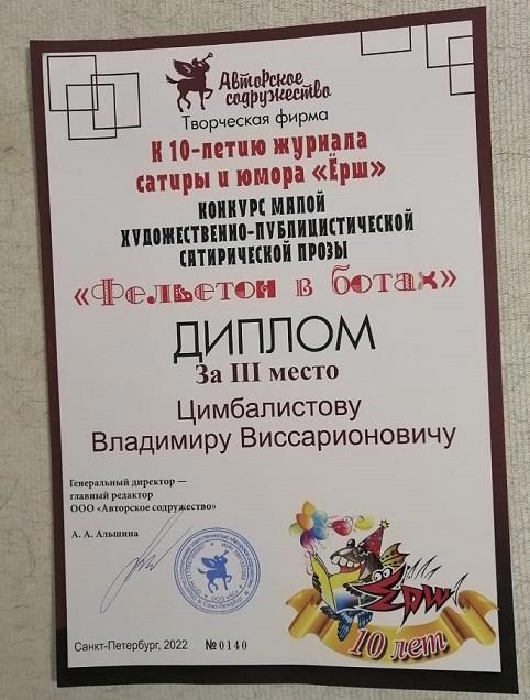Да-да, мне таки прислали диплом организаторы конкурса. Я уже писал ранее, что по итогам участия в конкурсе "Фельетон в ботах" мне присвоено III место. И вот приятная приятность – прислали диплом и несколько изданий – журнал сатиры и юмора «Ёрш», культурно-просветительский журнал «Час культуры» и поэтический буклет.