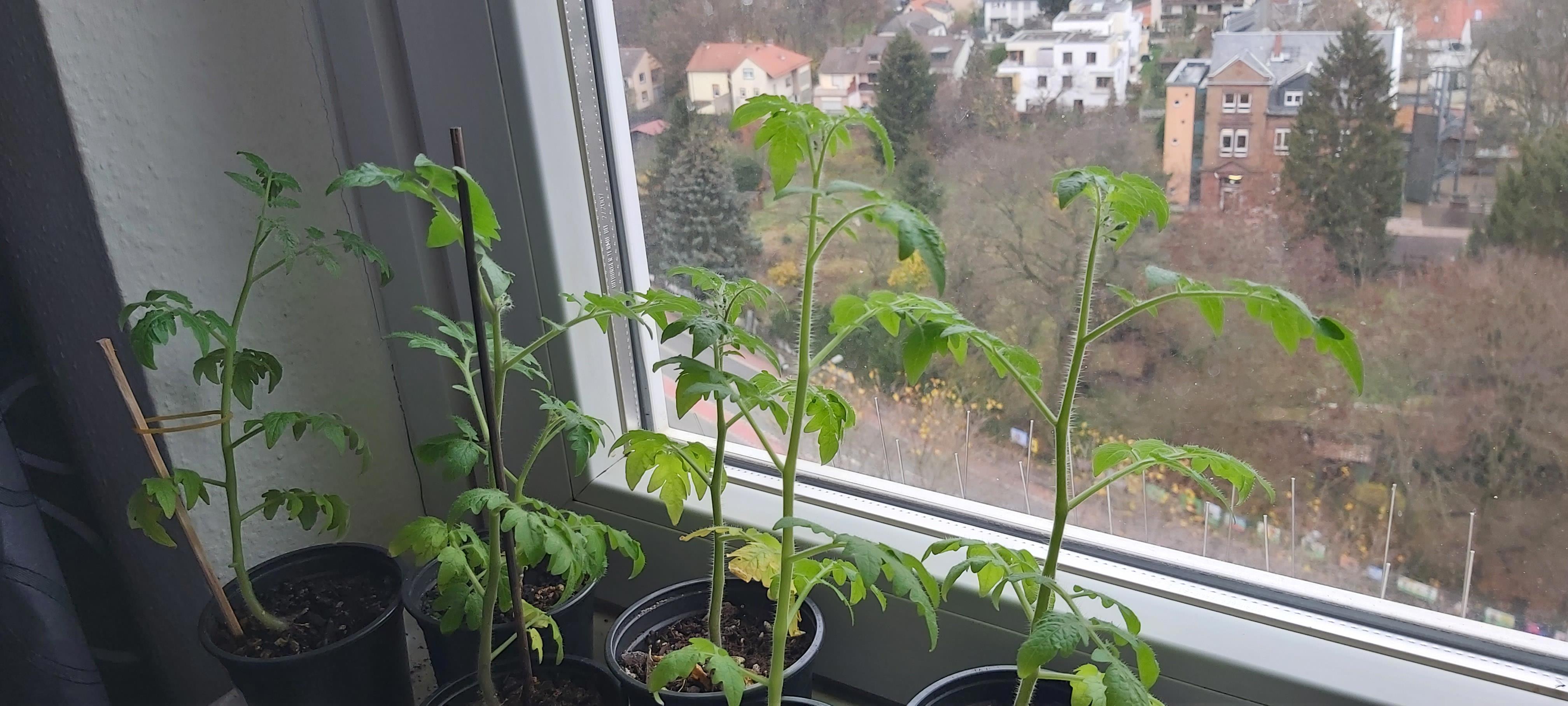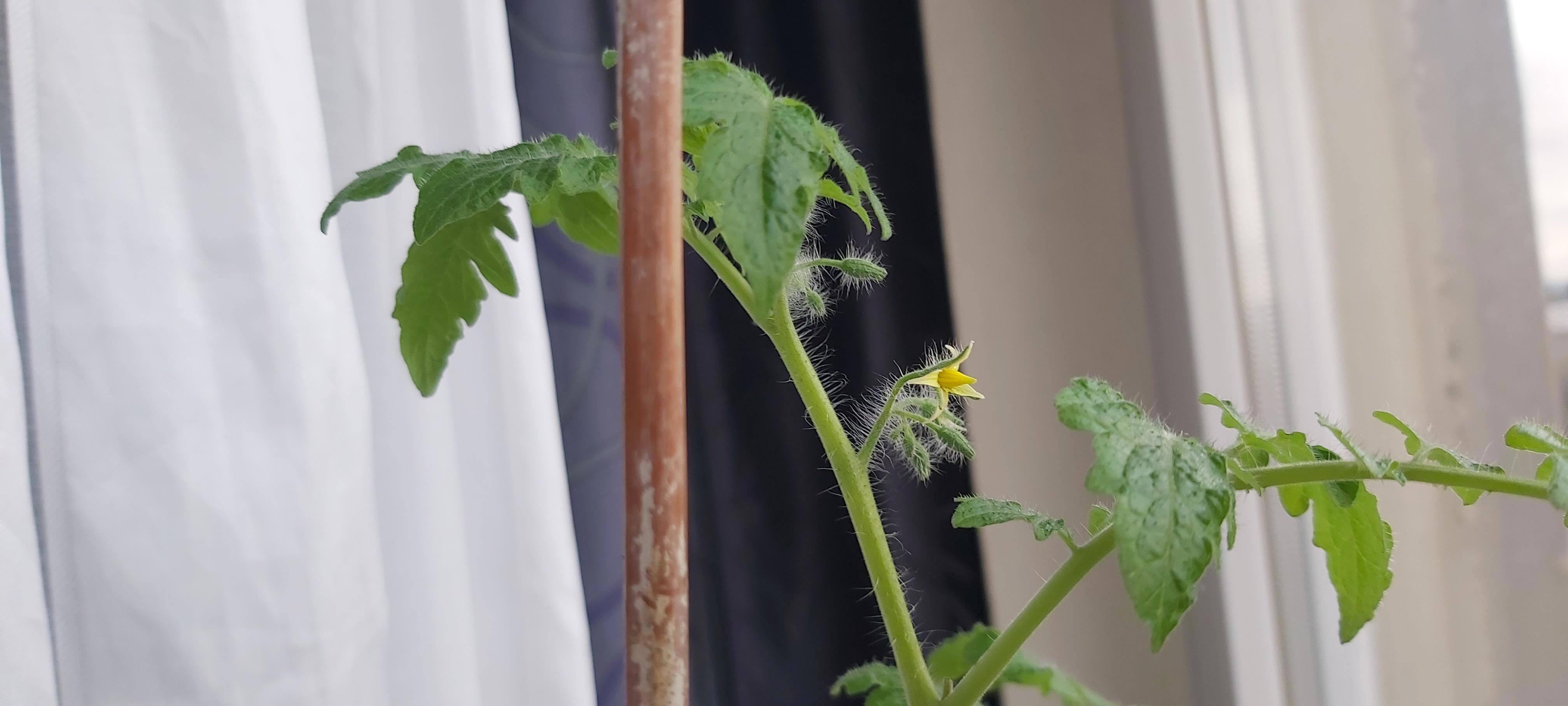 Я уже говорила, что у меня ростки помидор сами проклюнулись, ну так вот, самый первый кустик решил порадовать.