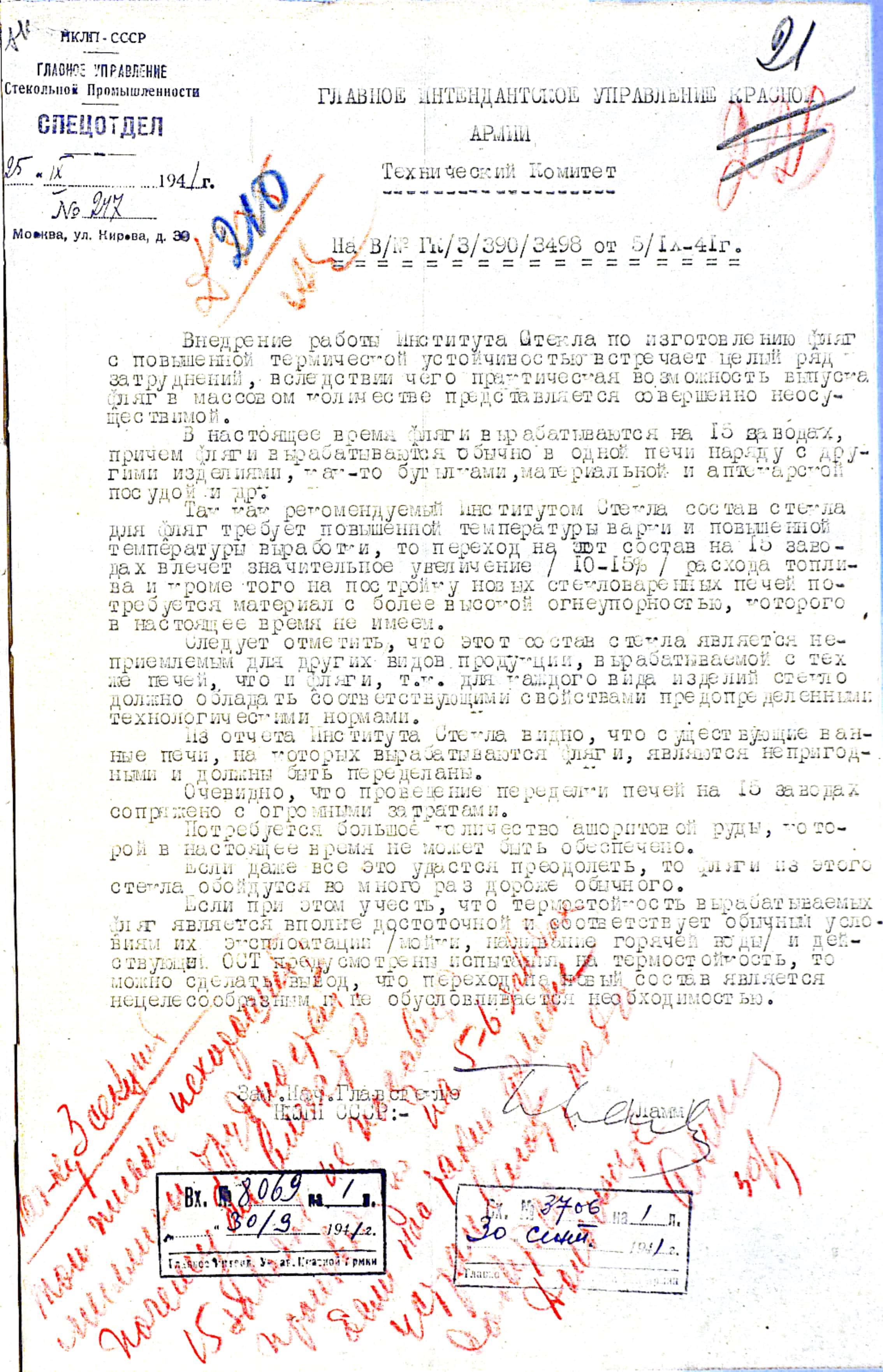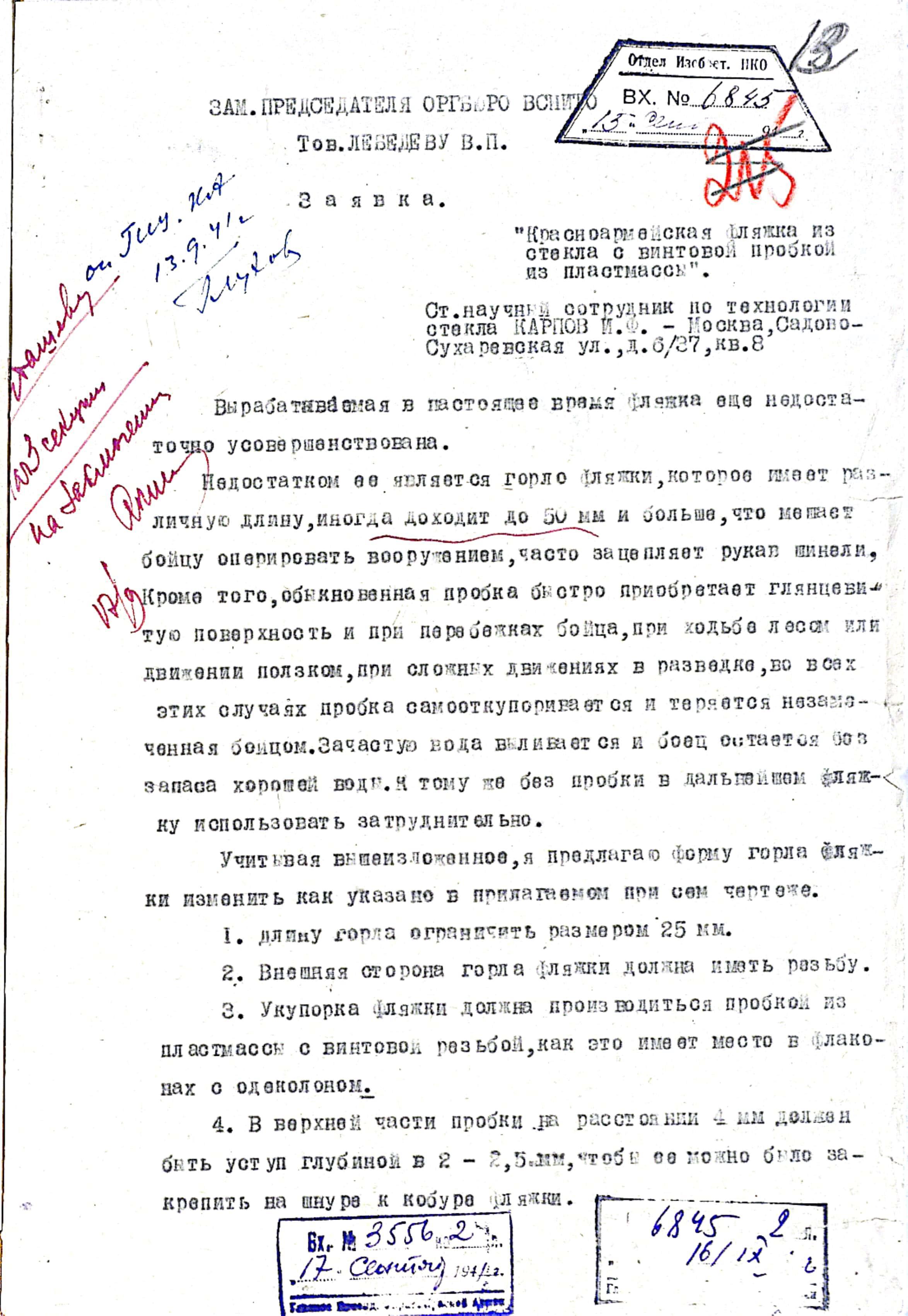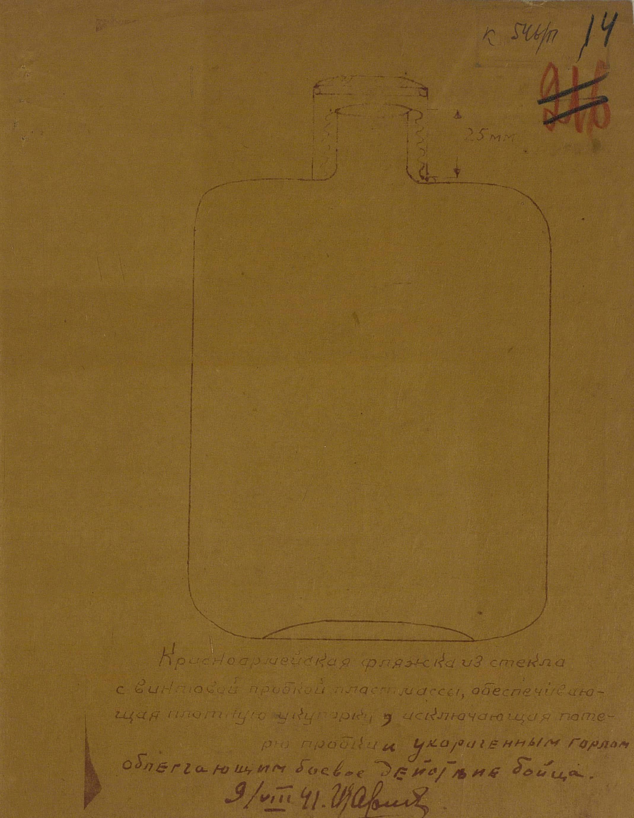 Хорошо известно, что в Красной Армии были серьёзные проблемы с обеспечением бойцов флягами. Самый крупный поставщик стеклянных фляг, Мерефянский стекольный завод, достаточно быстро оказался под оккупацией. Задача по выпуску продукции была распределена на другие предприятия, Институтом Стекла были разработаны новые технологии, но с их внедрением дело обстояло неважно.