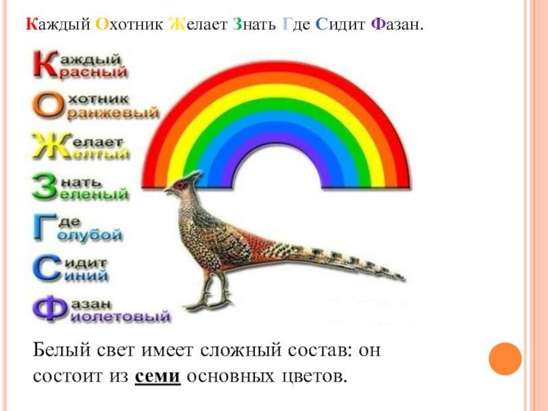 Мнемоническая фраза, используемая для запоминания основных цветов радуги.