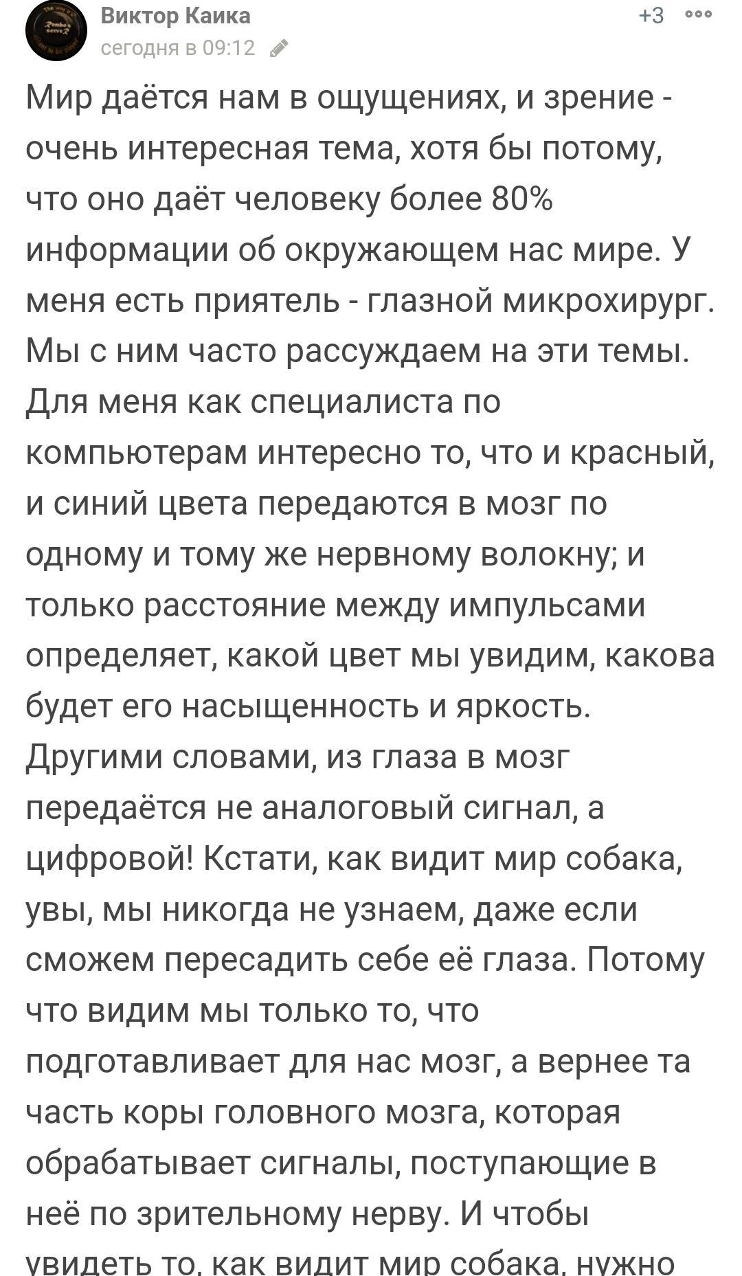 N.B. Это первая, можно сказать "сигнальная" статья из серии, в которой я хотел бы поговорить о зрении, цветах, остроте зрения, как мы и братья наши меньшие видят мир.