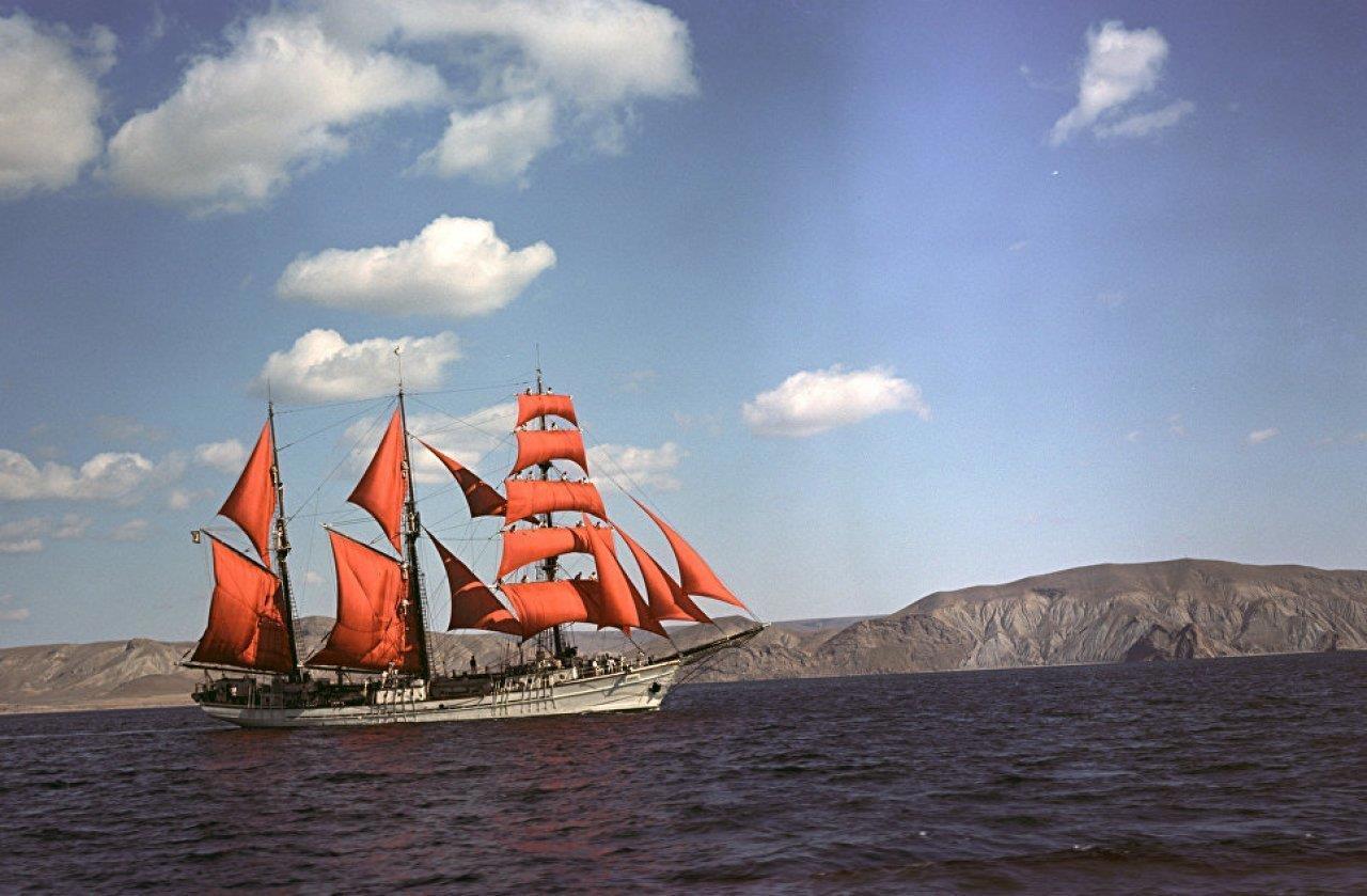 Самым ярким во всех смыслах этого слова стал, конечно же, кинодебют баркентины «Альфа».Учебный парусник ростовский мореходки передали для сьемок фильма по роману Александра Грина. Разумеется, «главной фишкой» должны были стать знаменитые паруса. Ткань взяли на фабрике по производству пионерских галстуков. Правда, киношникам пришлось проявить немало технической сноровки., чтобы добиться адекватной передачи цвета на тогдашней советской кинопленке. Времени у них было немного – тонкий шелк оказался не очень хорошей заменой настоящей парусине и быстро истрепался. После окончания сьемки часть ткани подарили училищу и ростовские курсанты некоторое время выделялись невиданными в СССР алыми шелковыми майками…