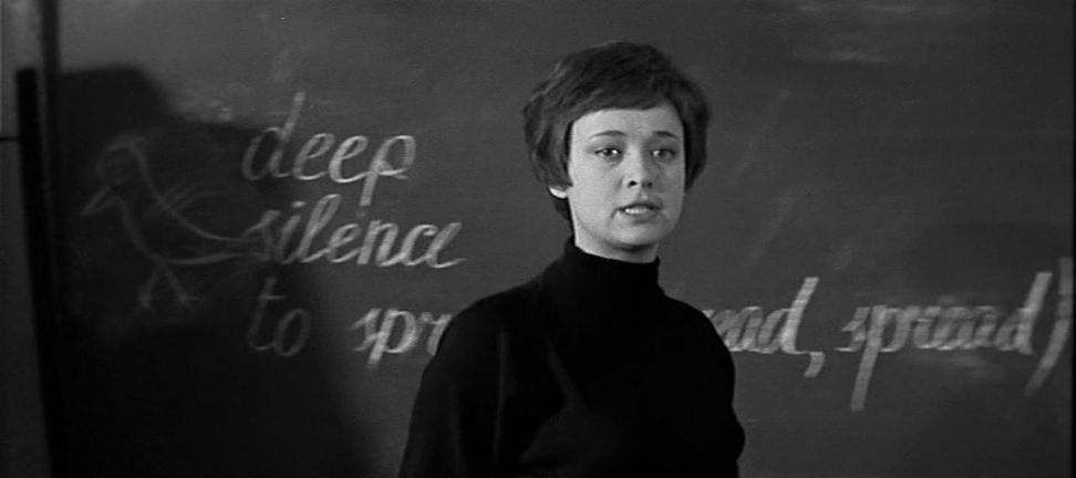 В школу приходит работать учительницей английского языка юная девушка, бывшая его ученица, и как позже по сюжету выясняется, по уши в него влюбленная. Он и ее отчитывает, жестит. Один из школьников притащил в класс ворону, которая каркает и носится по классу. Естественно, урок английского сорван, а молоденькая учительница лезет на стул ловить эту ворону.