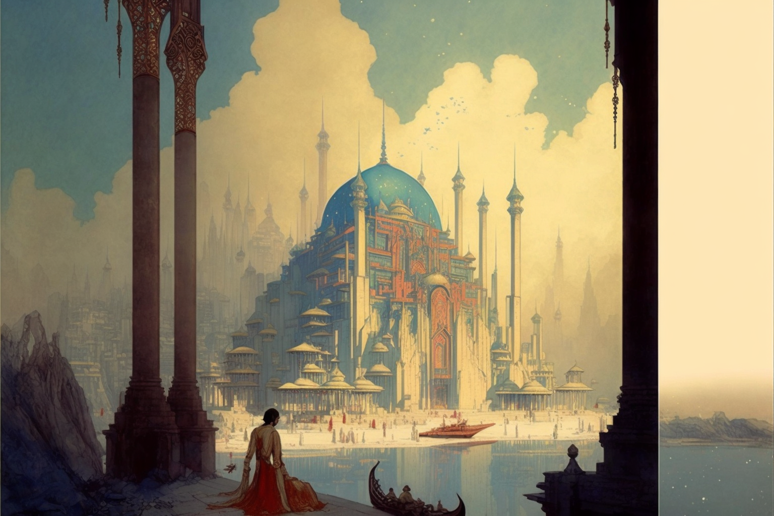 "Казалось, будто столица состояла из одних только арок и куполов. Дуги десятков мостов с коваными перилами были перекинуты через небольшие ручьи, пронизывающие город. Входы в высокие каменные дома с плоскими или косыми крышами были выполнены в виде одной – у зданий, что выглядели победнее – или трёх арок. Каждую окружал яркий орнамент из сотен переплетающихся листьев и ветвей, в которые искусно вплетались руны или письмена-заговоры. По преданиям, такой узор помогал отвадить от дома посланников Тёмных Богов, что обязательно тянули за собой болезни и несчастья.